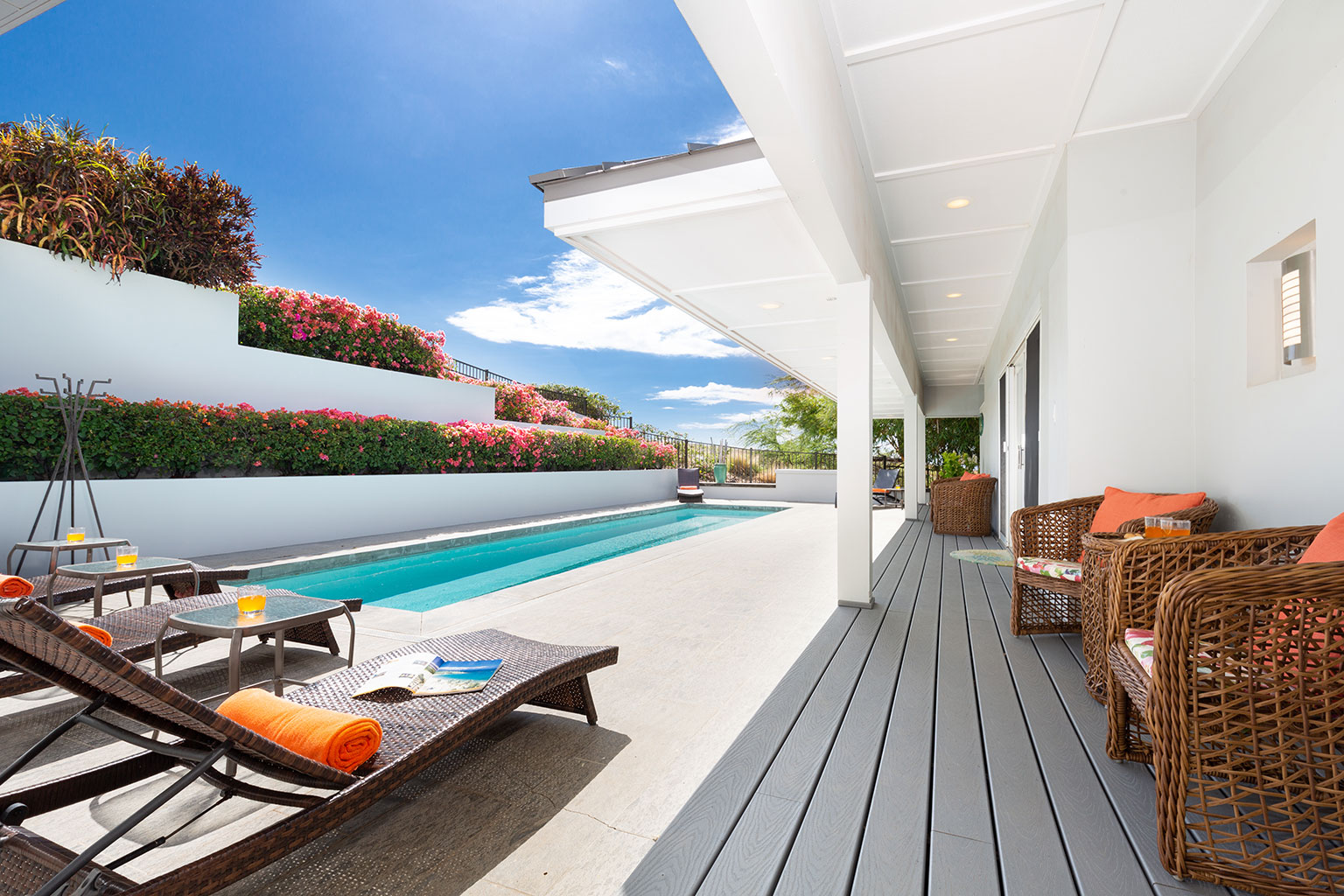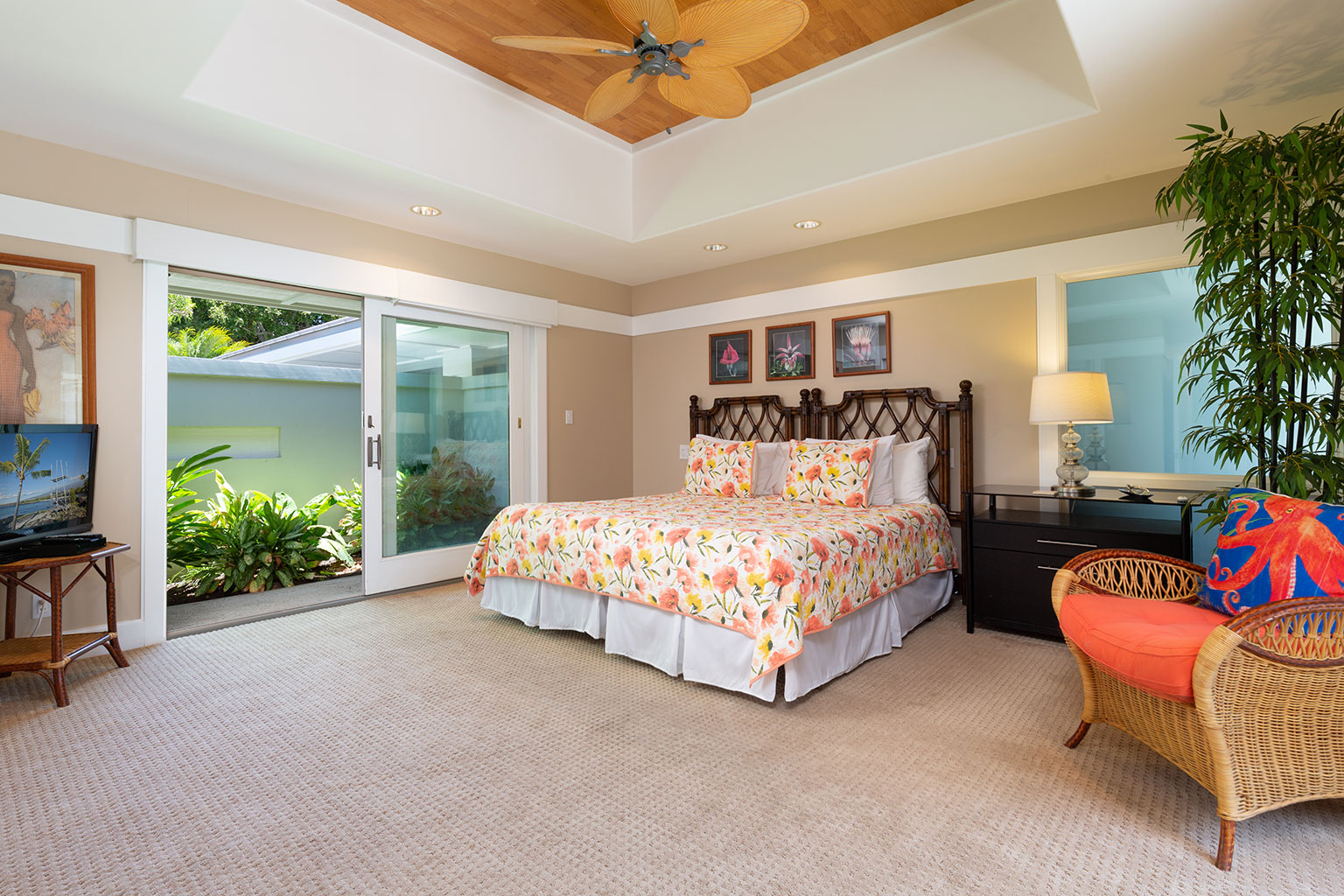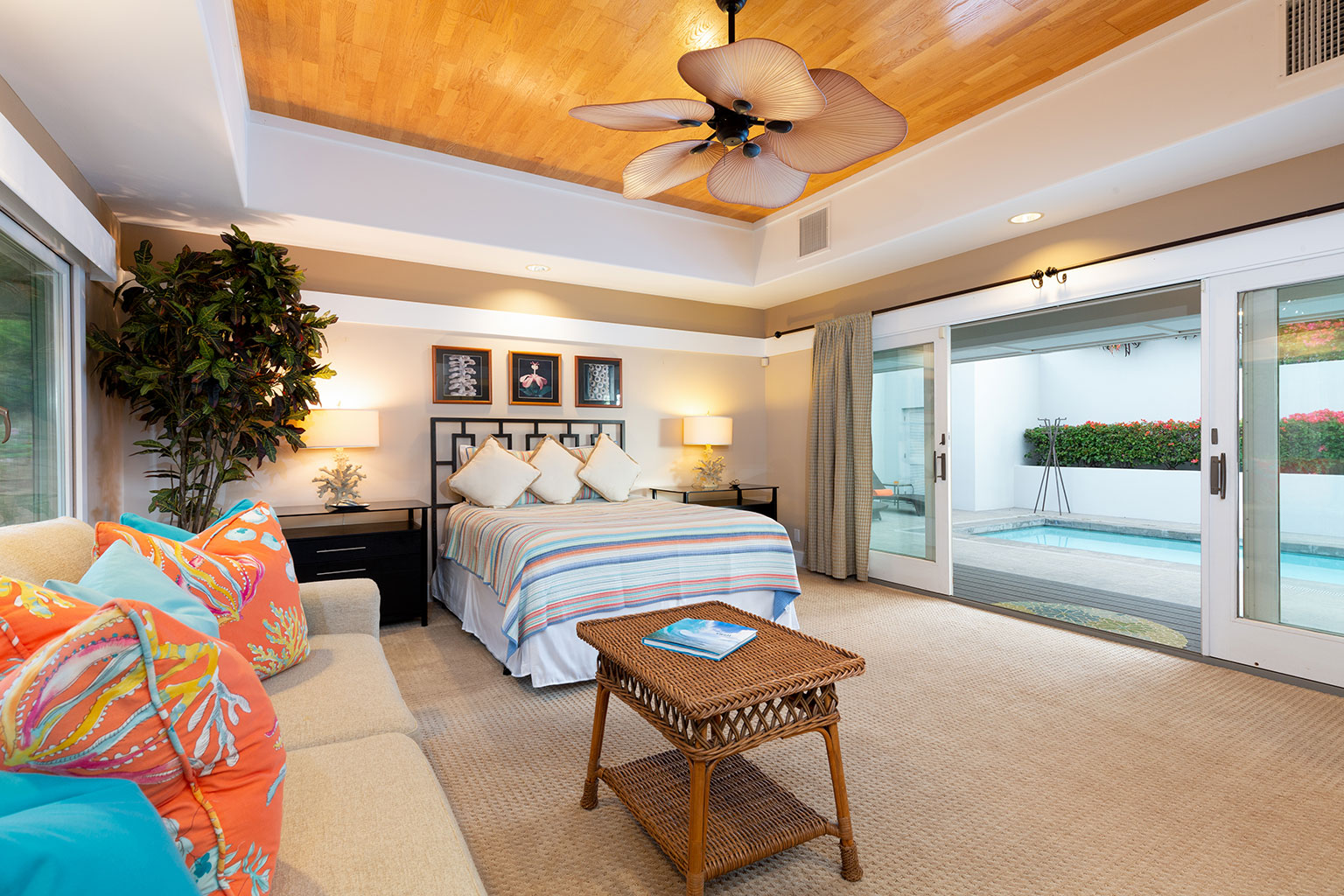 コートヤードを含む6か所のアウトドアスペースで読書を楽しんだり、屋外においてある卓球台で家族や友達とゲームをしたりも一興です。メインレジデンスには3つの寝室があり、プライマリースイートにはキングベッド1台が入っており、素晴らしいオーシャンビューの景色を望み、屋内ウォークインシャワーや屋外のバスタブがあるバスルームも併設されています。セカンダリースイートにはクイーンベッドが1台が入っており、バスルームにはジャグジータブもあります。3つ目の寝室には、合わせて使うとキングベッドになるツインベッドが2台入っており、自由にアレンジしていただけます。階下にあるゲストハウスの方に行きますと、プライベートラッププール、ビーチチェアがあります。ゲストハウスにはクイーンベッド1台とクイーンサイズのソファーベッドが1台が入っており、小さなキチネットとラウンジエリアにつながるバスルーム、屋外シャワーが併設されています。