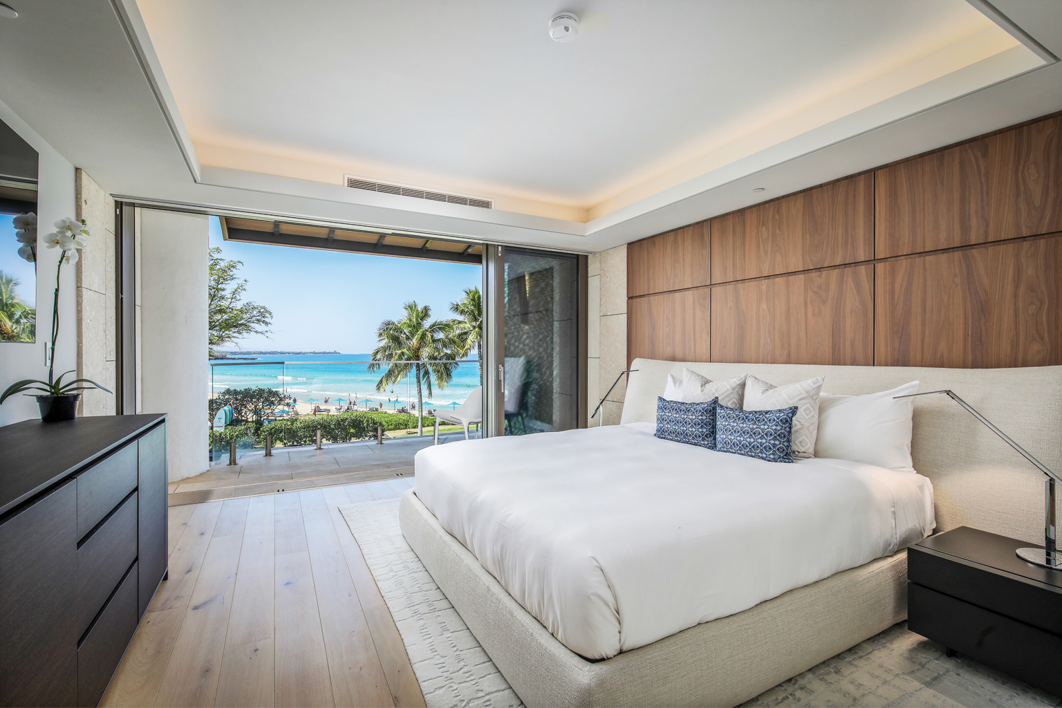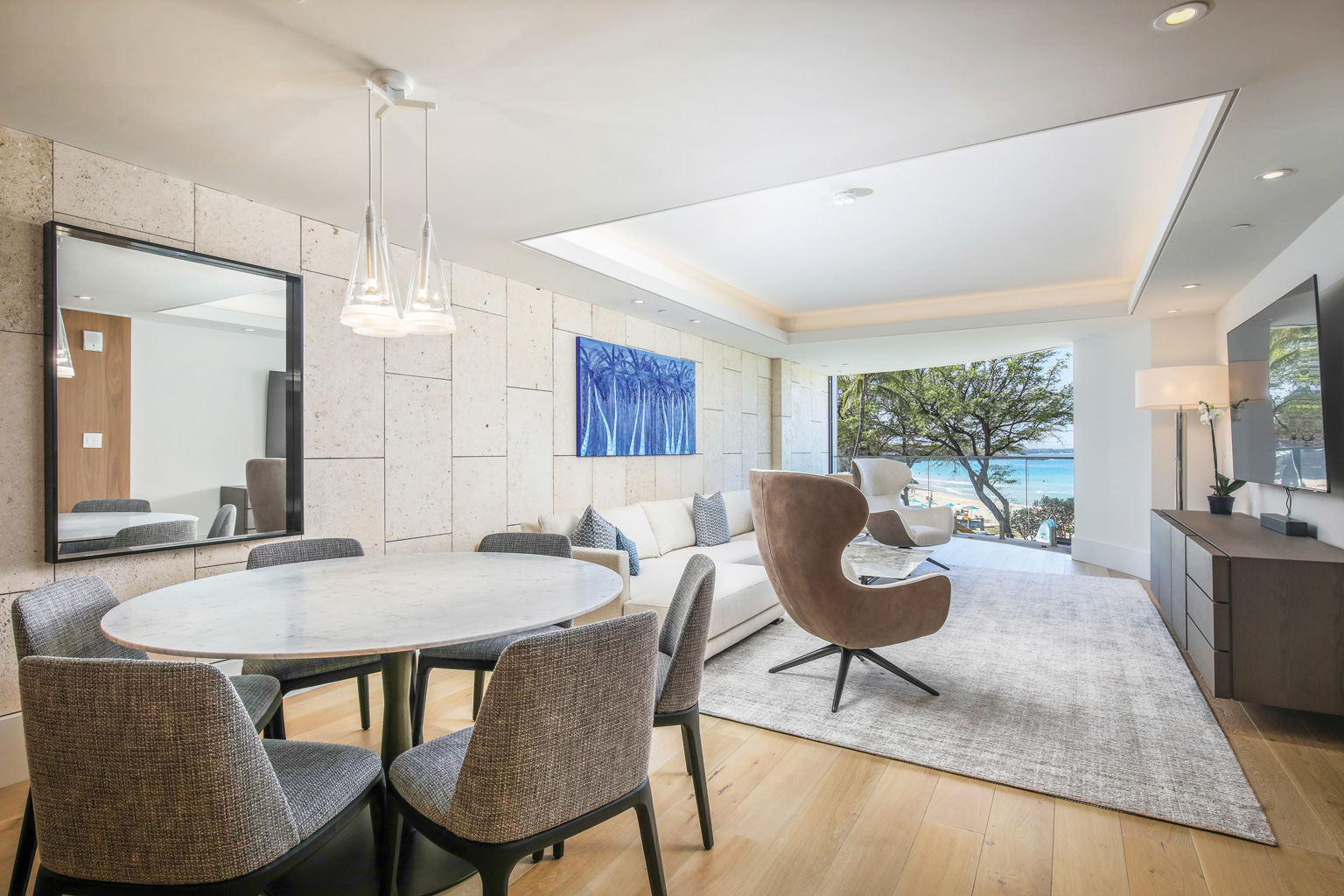 2階に位置するハワイの傑作ともいえるこのオーシャンフロントのレジデンスには、床から天井まで広がる壁一面の大きなスライド ガラス窓が屋内と屋外のスペースを一体化するリビング エリア、Wolf製やSub-Zero製の調理機器をそろえたグルメなキッチン、ワインセラー、ハンドクラフトのキャビネット、6人用のダイニングテーブルをご提供しております。