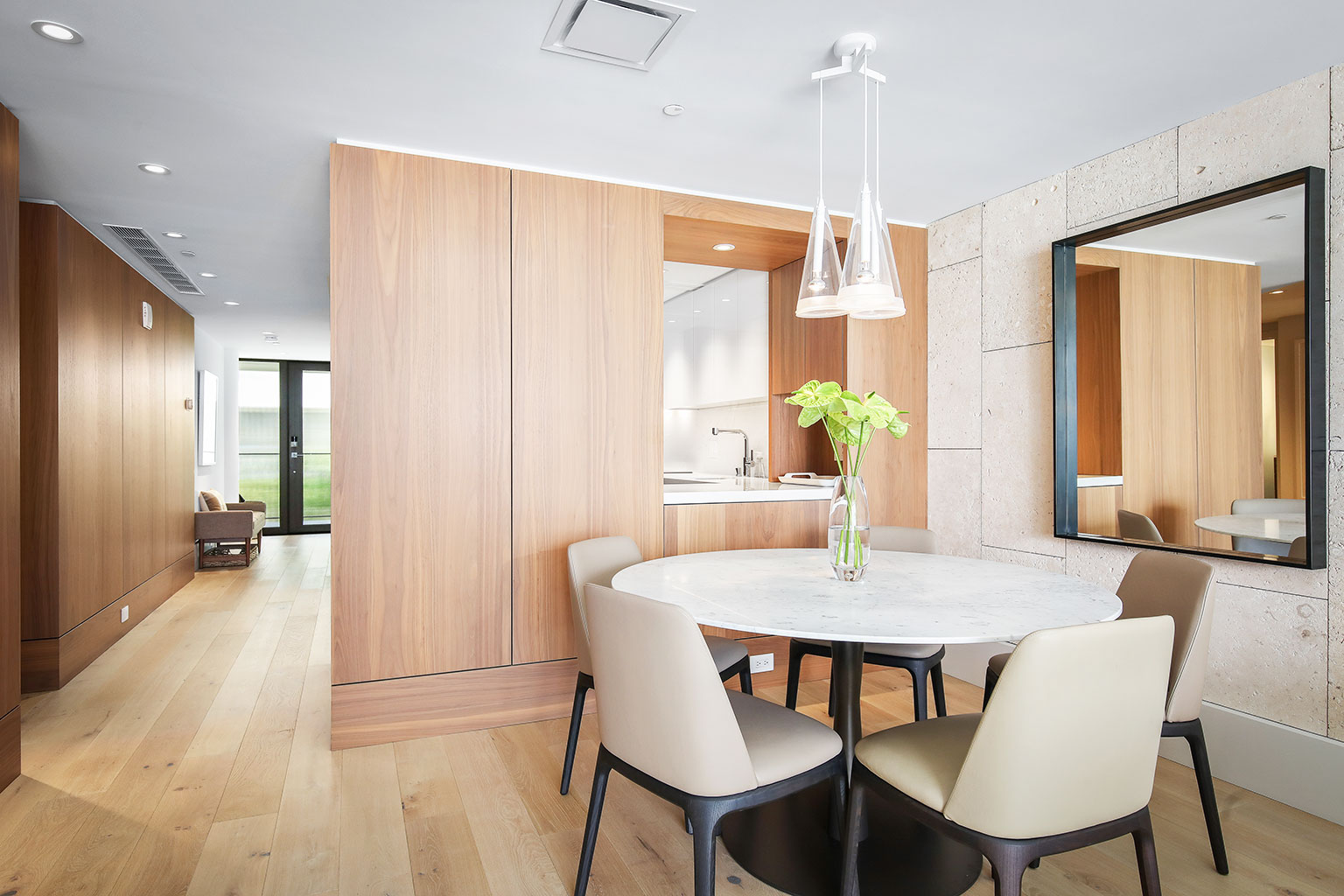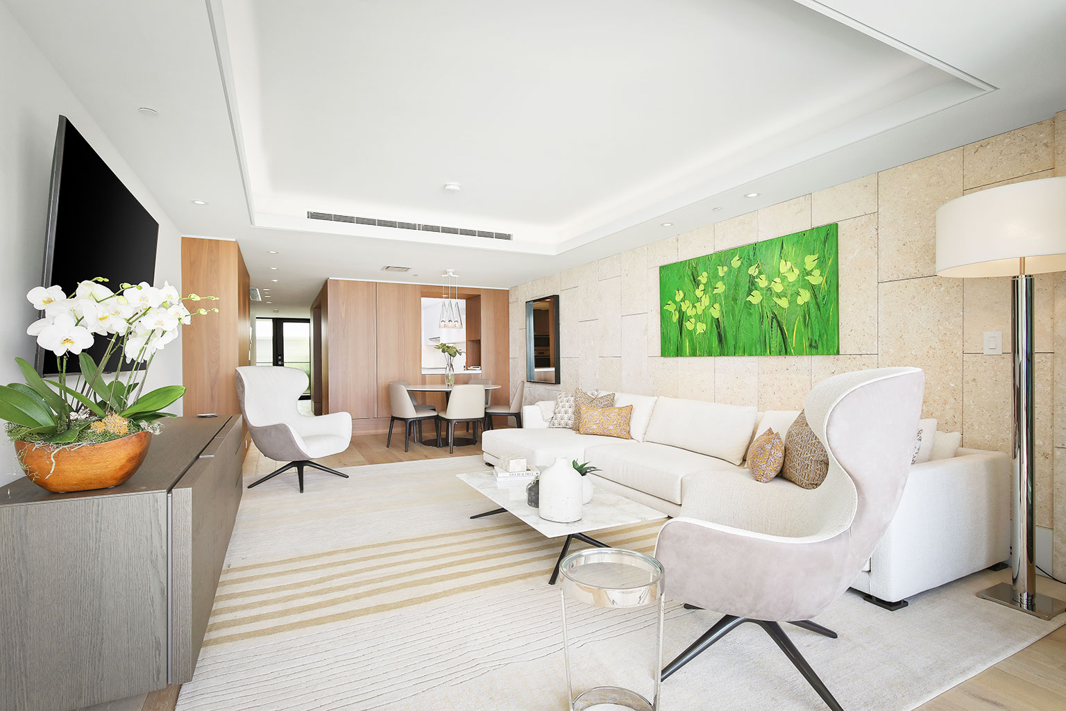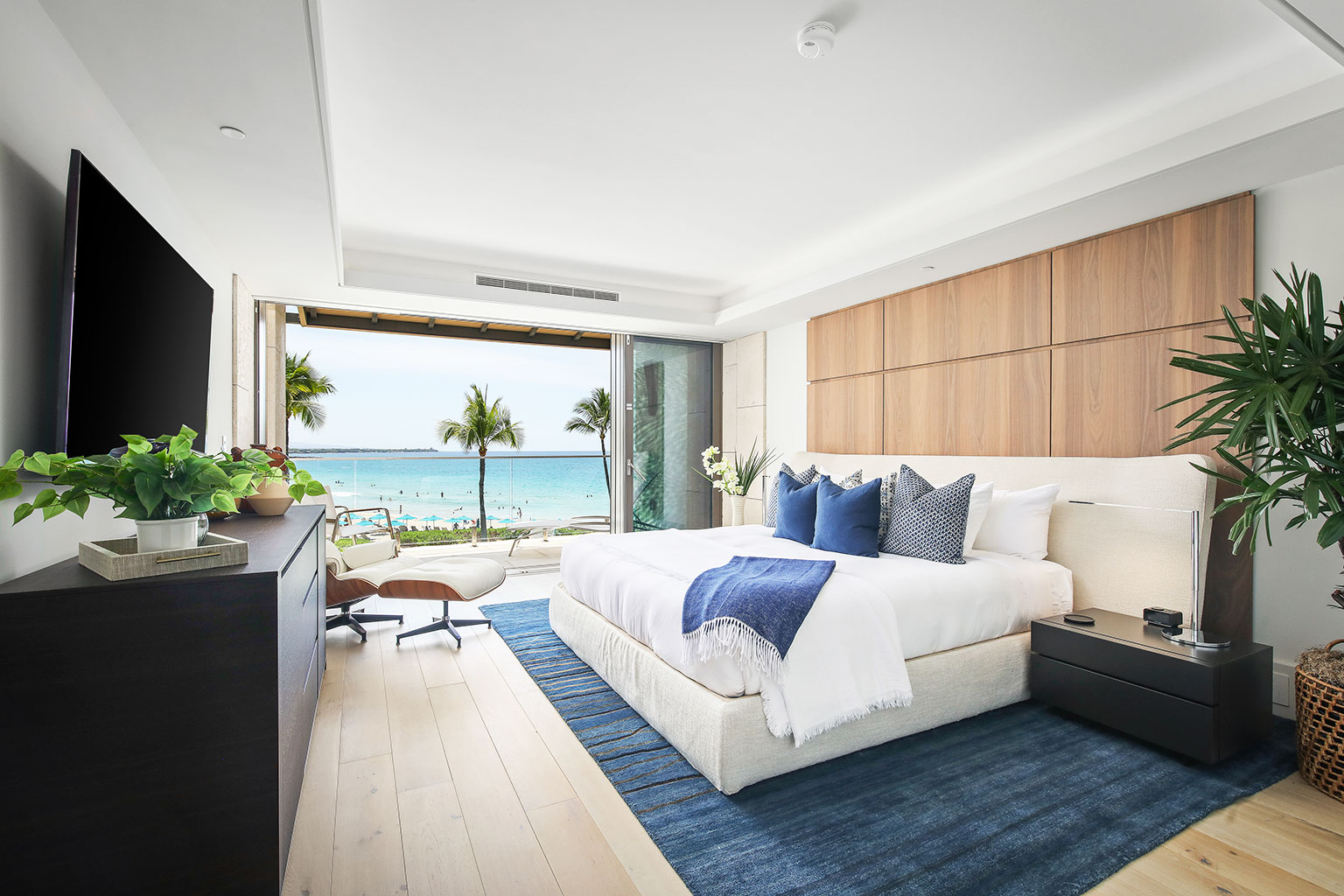 ハワイの傑作ともいえるこのオーシャンフロントのレジデンスには、床から天井まで広がる壁一面の大きなスライド ガラス窓が屋内と屋外のスペースを一体化するリビング エリア、Wolf製やSub-Zero製の調理機器をそろえたグルメなキッチン、ワインセラー、ハンドクラフトのキャビネット、5人用のダイニングテーブルをご提供しております。