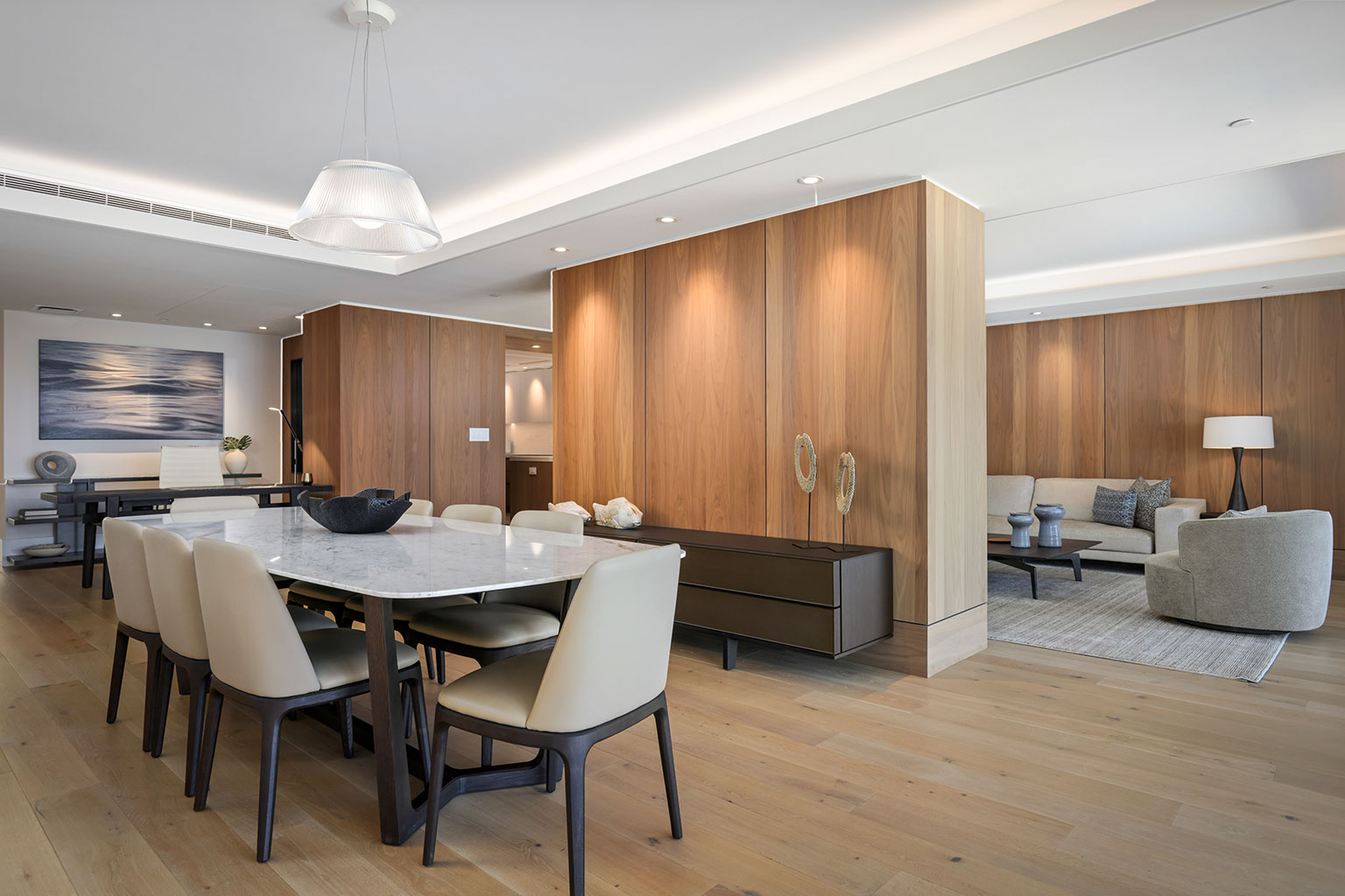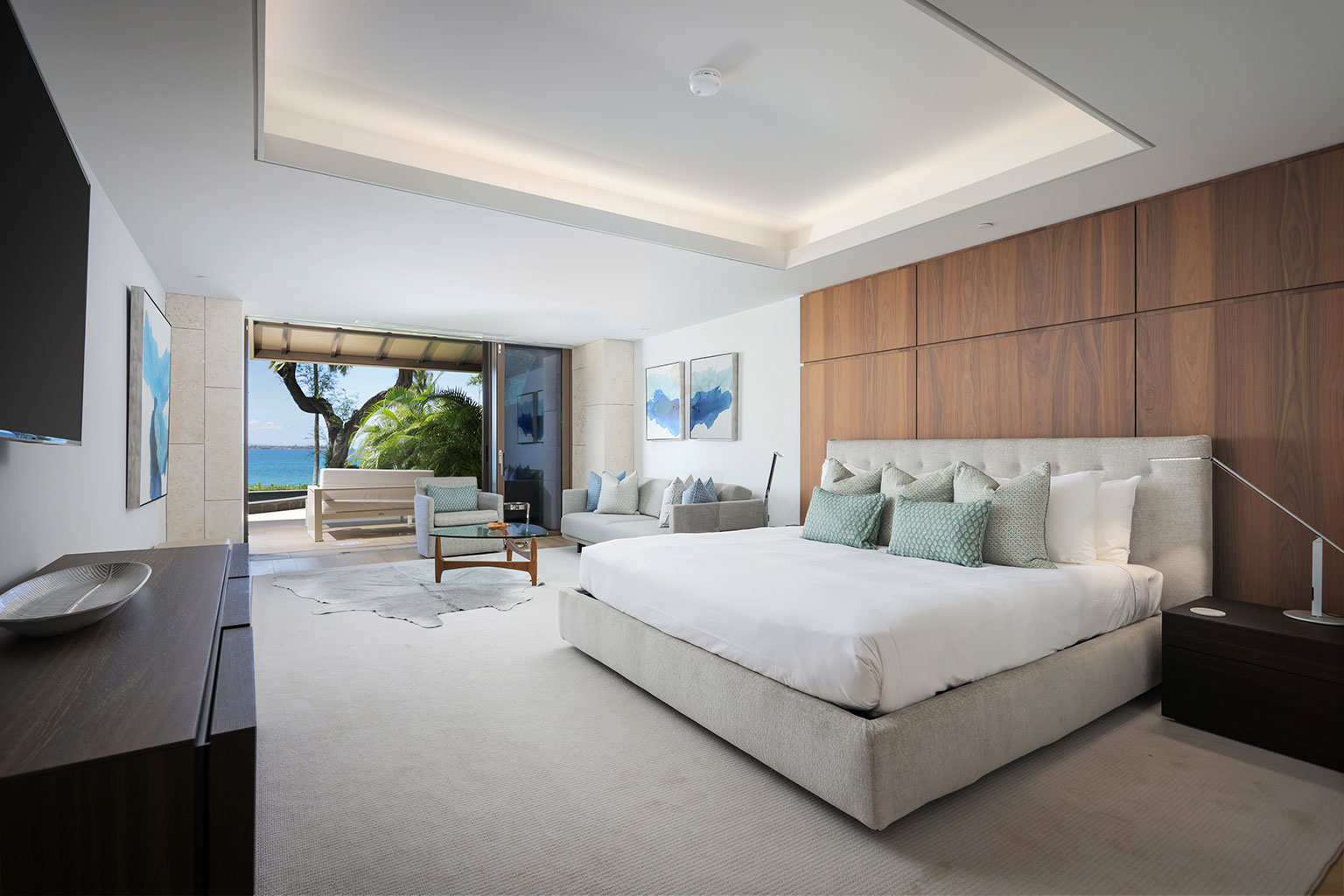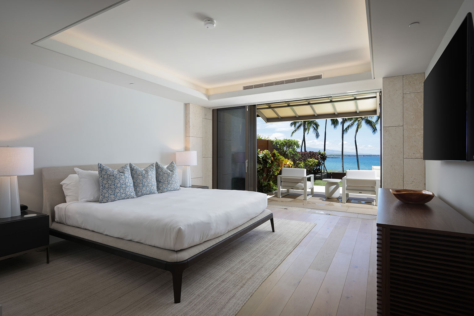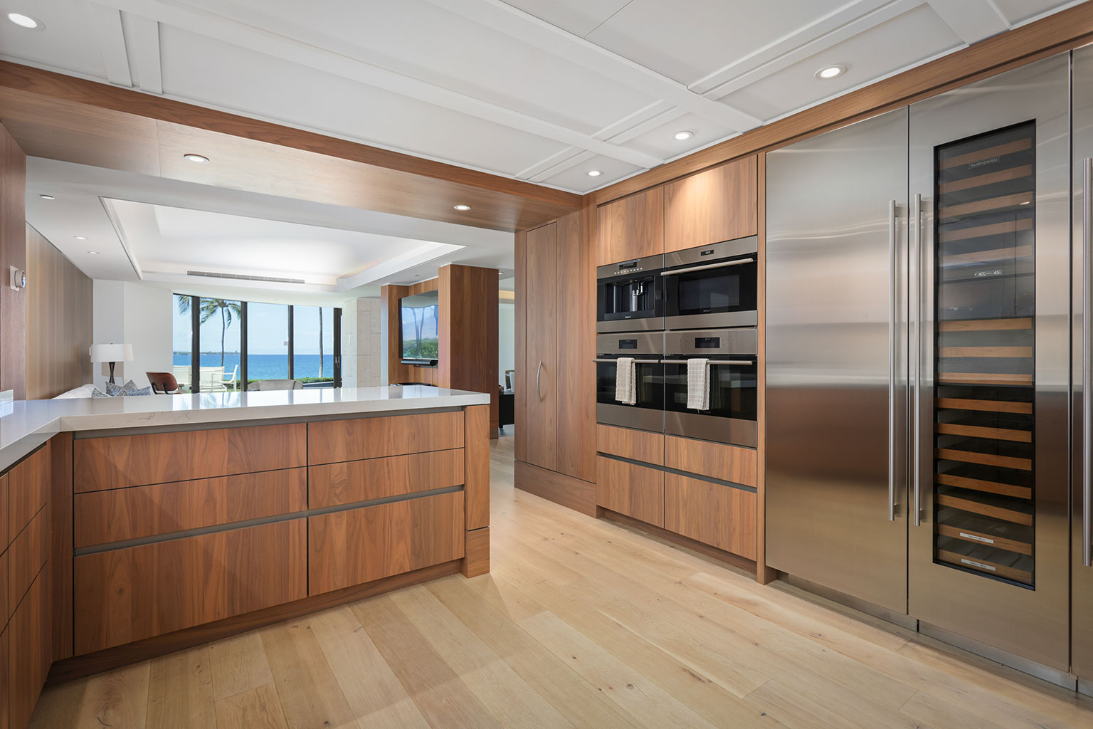 1階に位置する贅を尽くしたオーシャンフロント レジデンス。ビーチへのアクセスが便利でありながら、プライバシーとスペースも兼ね添えています。床から天井まで広がる壁一面の大きなスライド ガラス窓、ダブルオーブン、ワインセラー、プロシリーズのWolf製、Sub-Zero製、Miele製の調理機器をそろえたキッチン、8人用のダイニングテーブルをご提供しております。
