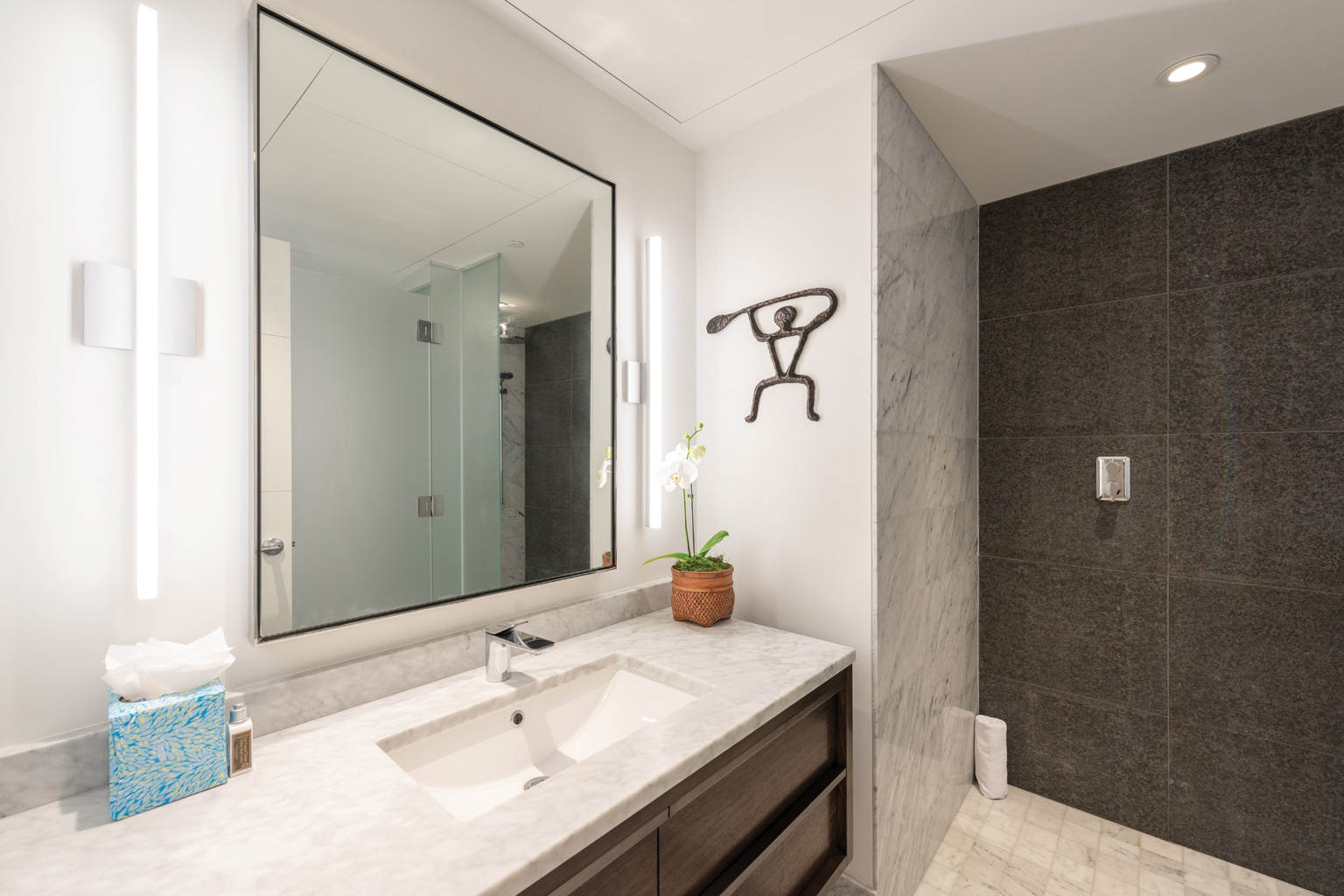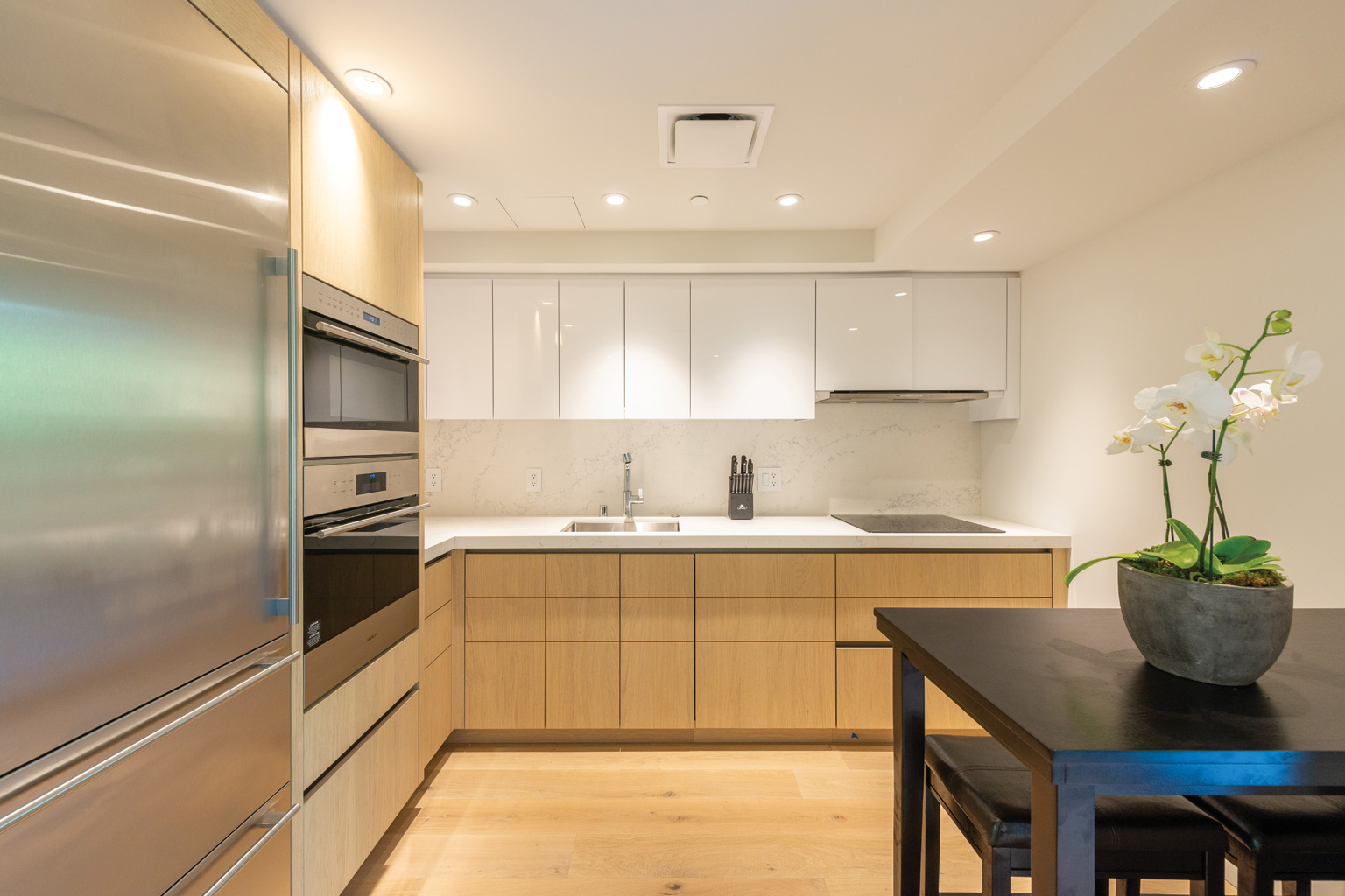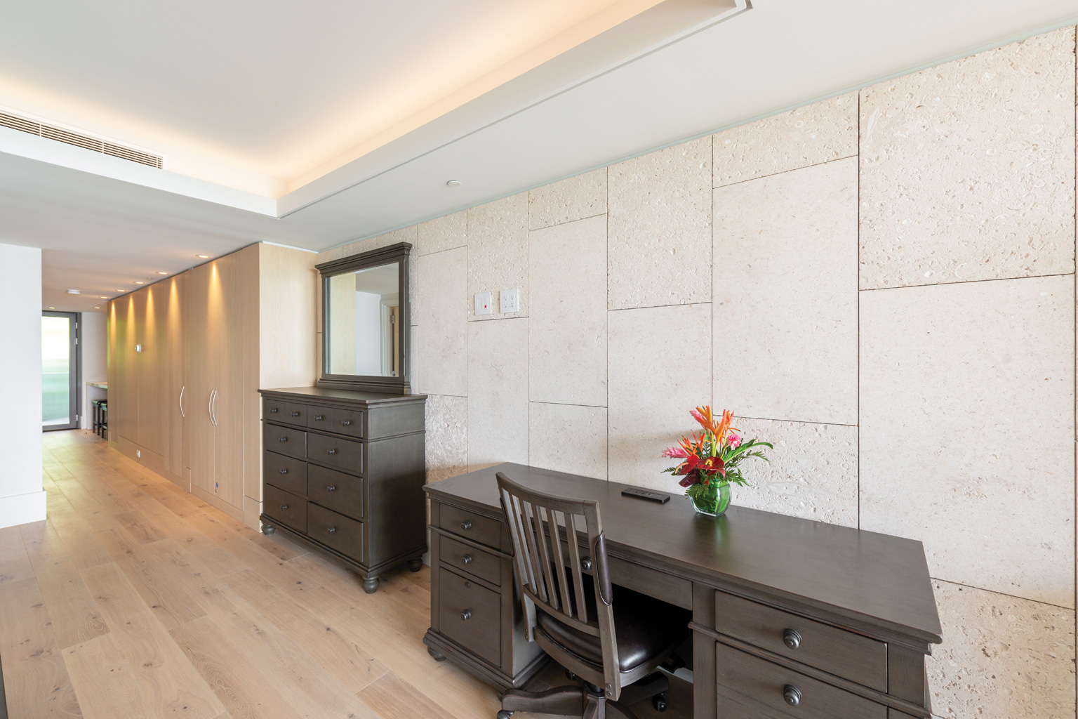 2階に位置するこの心地よい新築オーシャンフロント ステュディオでは、床から天井まで広がる壁一面の大きなスライド ガラス窓が屋内と屋外のスペースを一体化するリビング エリア、シェフが愛用するWolf製やSub-Zero製、Miele製の調理機器をそろえた洗練されたキッチン、ワインセラー、そしてハンドクラフトのキャビネットをご提供しております。