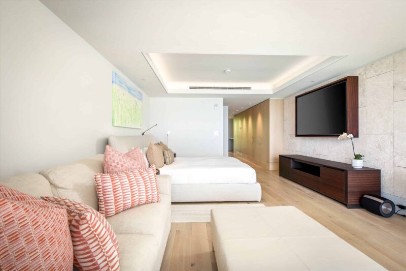 3階に位置するこのオーシャンフロントの素敵な新築ステュディオでは、床から天井まで広がる壁一面の大きなスライド ガラス窓が屋内と屋外のスペースを一体化するリビング エリア、シェフが愛用するWolf製やSub-Zero製、Miele製の調理機器をそろえた豪華プロ キッチン、ワインセラー、そしてハンドクラフトのキャビネットをご提供しております。