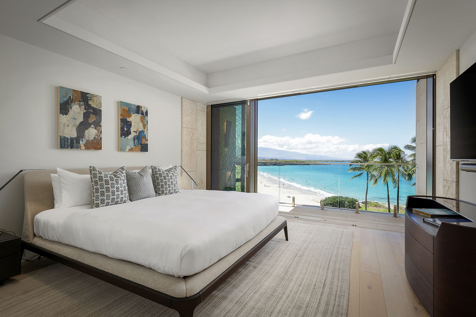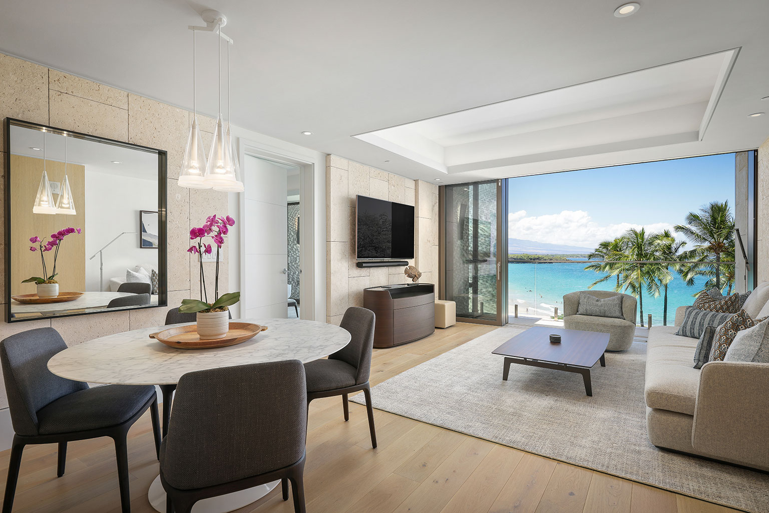 きらきらと輝く海を見渡すこのオーシャンフロントの美しいレジデンスには、床から天井まで広がる壁一面の大きなスライド ガラス窓が屋内と屋外のスペースを一体化するリビング エリア、Wolf製やSub-Zero製の調理機器をそろえた本格的グルメキッチン、ワインセラー、手作りされたキャビネット、4人で座っていただけるダイニングテーブルがあります。ハードウッドフロアのデュアル・スイートで、1室にはキングベッドが1台、もう1室にはクイーンベッドが1台あり、それぞれ豪華なバスルームが併設されています。洗濯機/乾燥機、エアコン完備。ハプナゴルフコースのクラブハウス至近です。