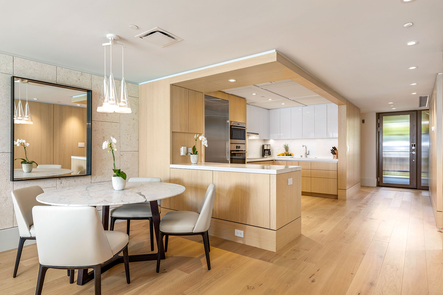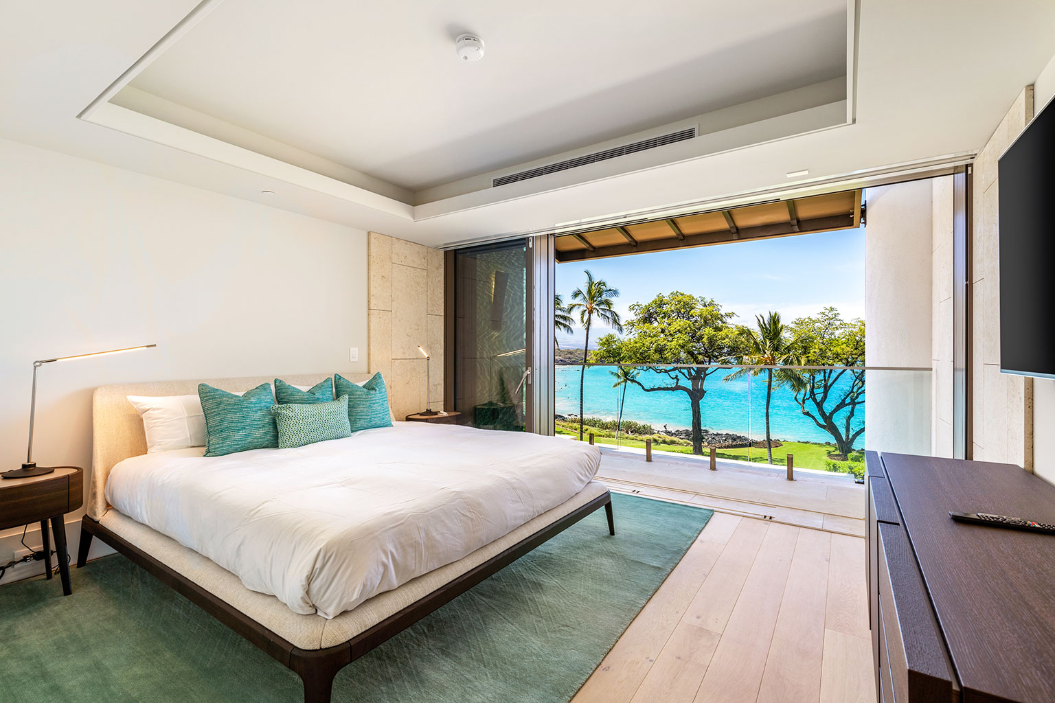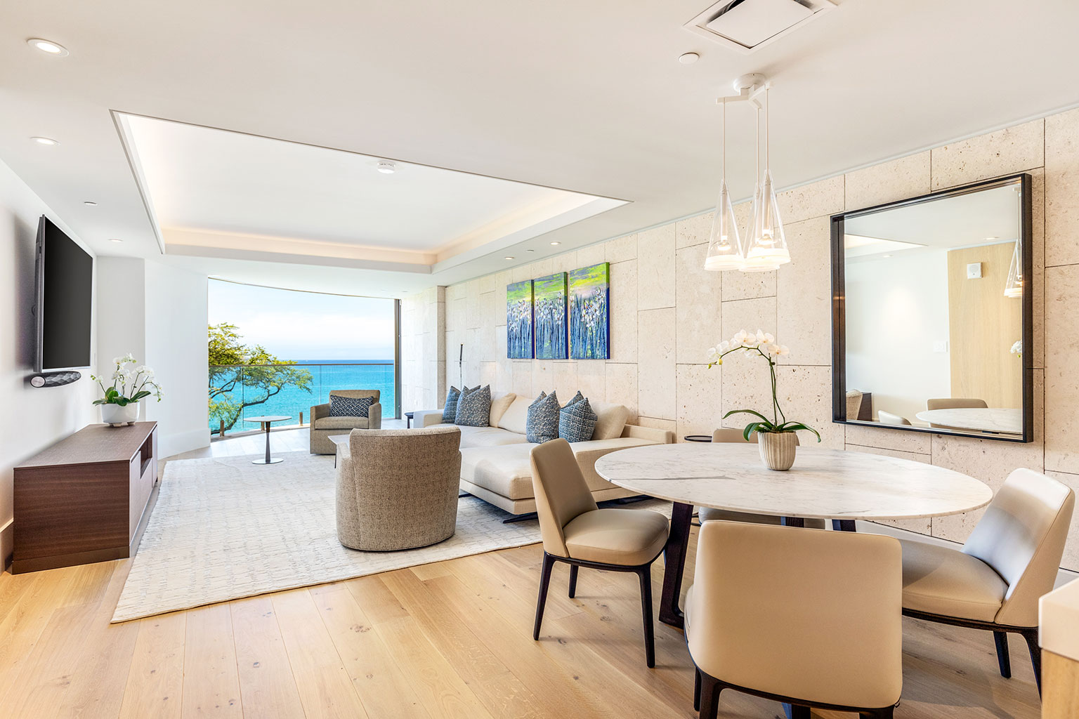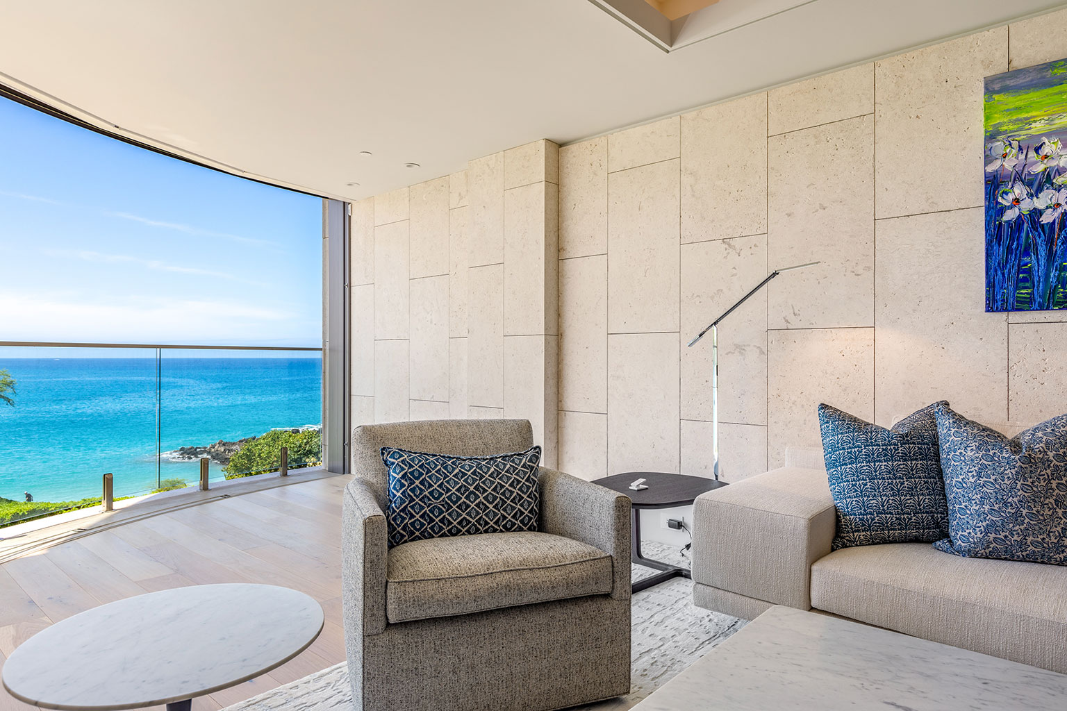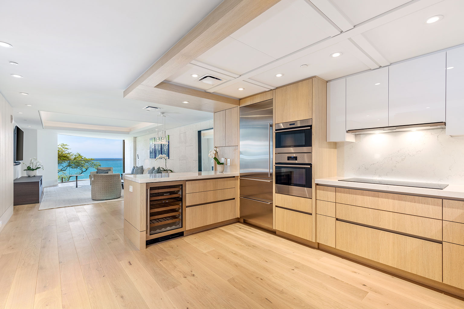 4階に位置するコンテンポラリー ハワイアンの傑作ともいえるこの新築オーシャンフロントレジデンスでは、床から天井まで広がる壁一面の大きなスライド ガラス窓が屋内と屋外のスペースを一体化するリビング エリア、シェフが愛用するWolf製やSub-Zero製、Miele製の調理機器をそろえたプロ キッチン、ワインセラー、そしてハンドクラフトのキャビネットをご提供しております。