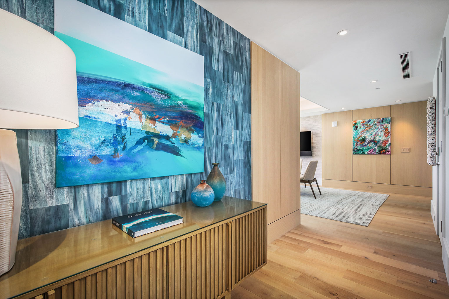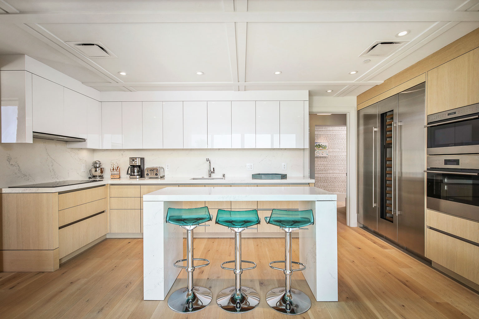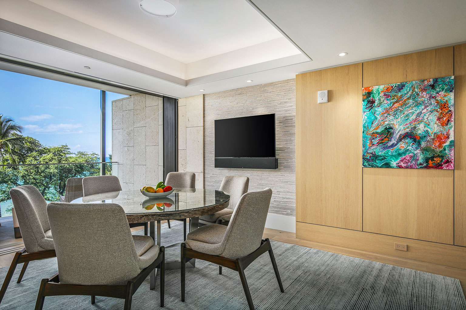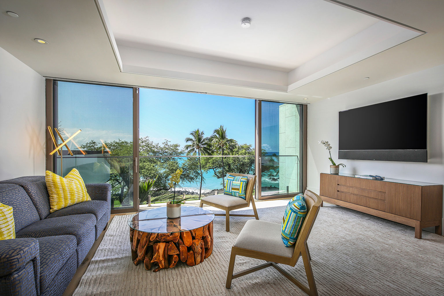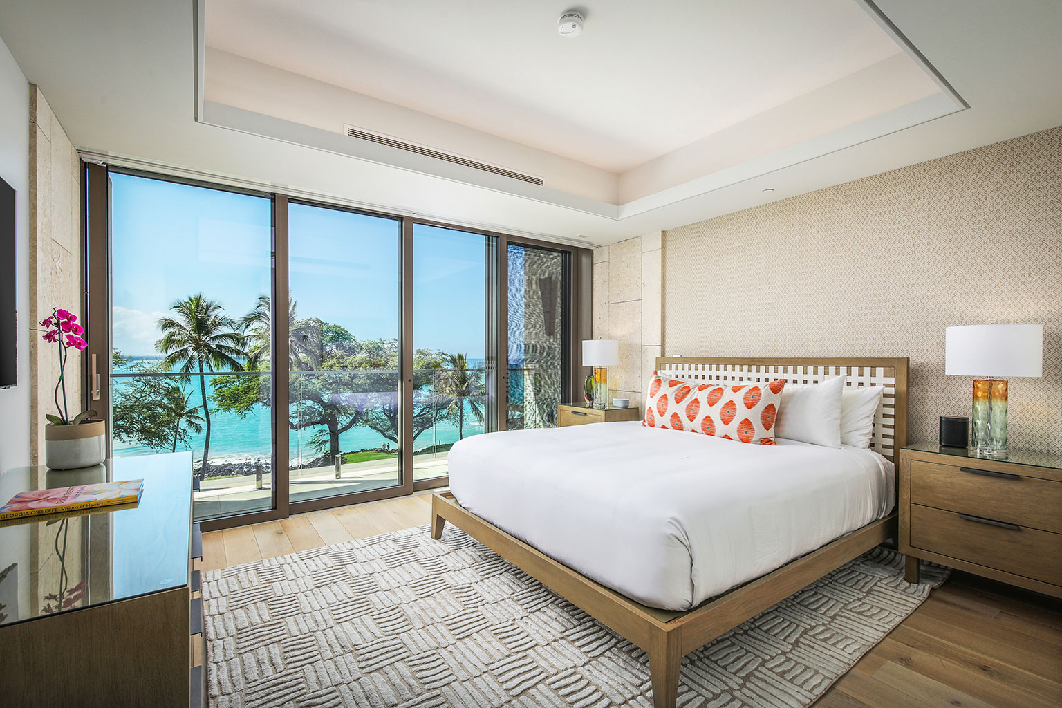 壮大なオーシャンフロントのこの新築レジデンスには、床から天井まで広がる壁一面の大きなスライド ガラス窓が屋内と屋外のスペースを一体化するリビング エリア、ダブルオーブン、ワインセラー、プロシリーズのWolf製とSub-Zero製の調理機器をそろえた絶妙なキッチン、6人用ダイニングテーブルをご提供しています。