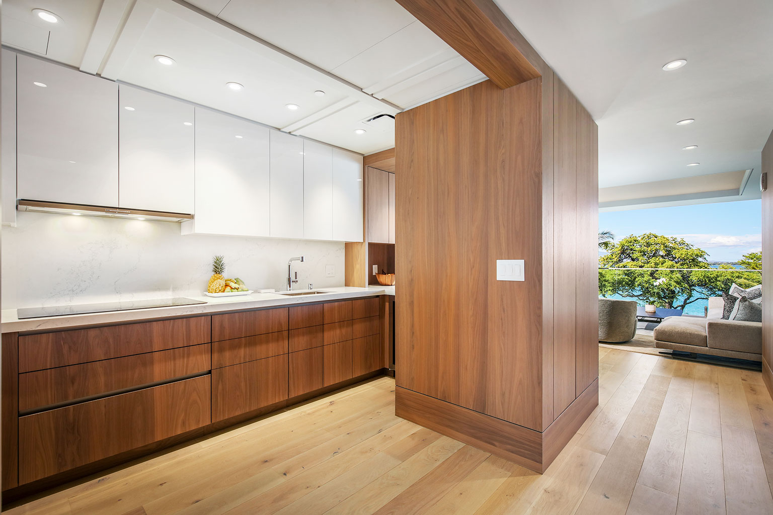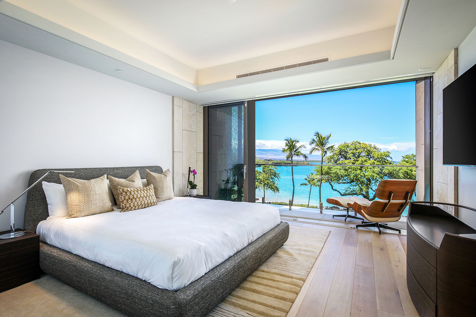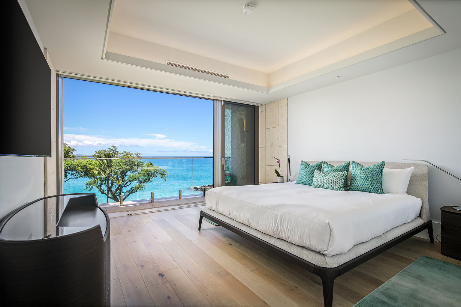 ハワイの傑作ともいえるこの贅沢な新築オーシャンフロント レジデンスでは、床から天井まで広がる壁一面の大きなスライド ガラス窓が屋内と屋外のスペースを一体化するリビング エリア、シェフが愛用するWolf製やSub-Zero製の調理機器をそろえたスタイリッシュな豪華プロ キッチン、ダブルオーブン、ワインセラー、ハンドクラフトのキャビネット、そして6人掛けのダイニングテーブルをご提供しております。