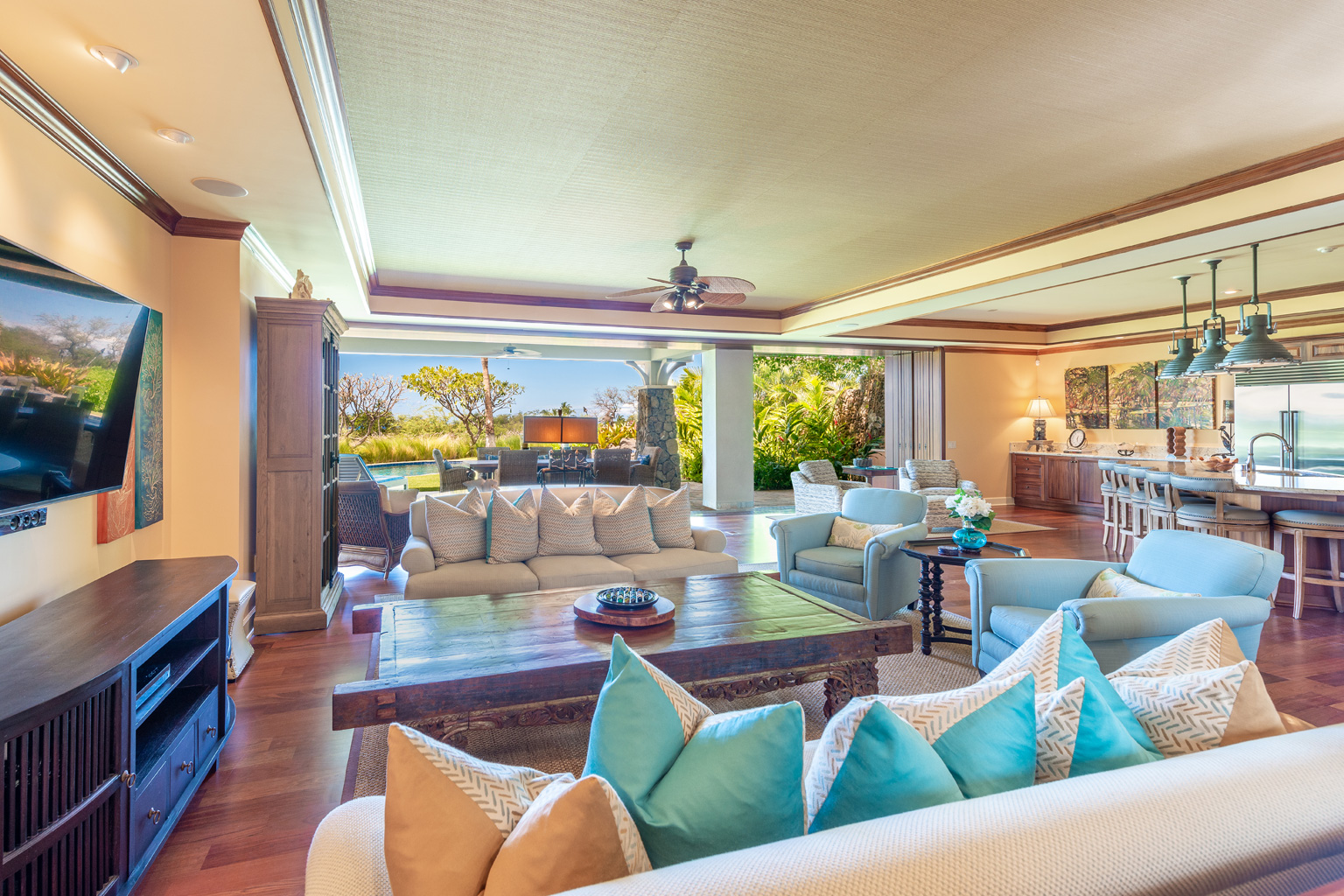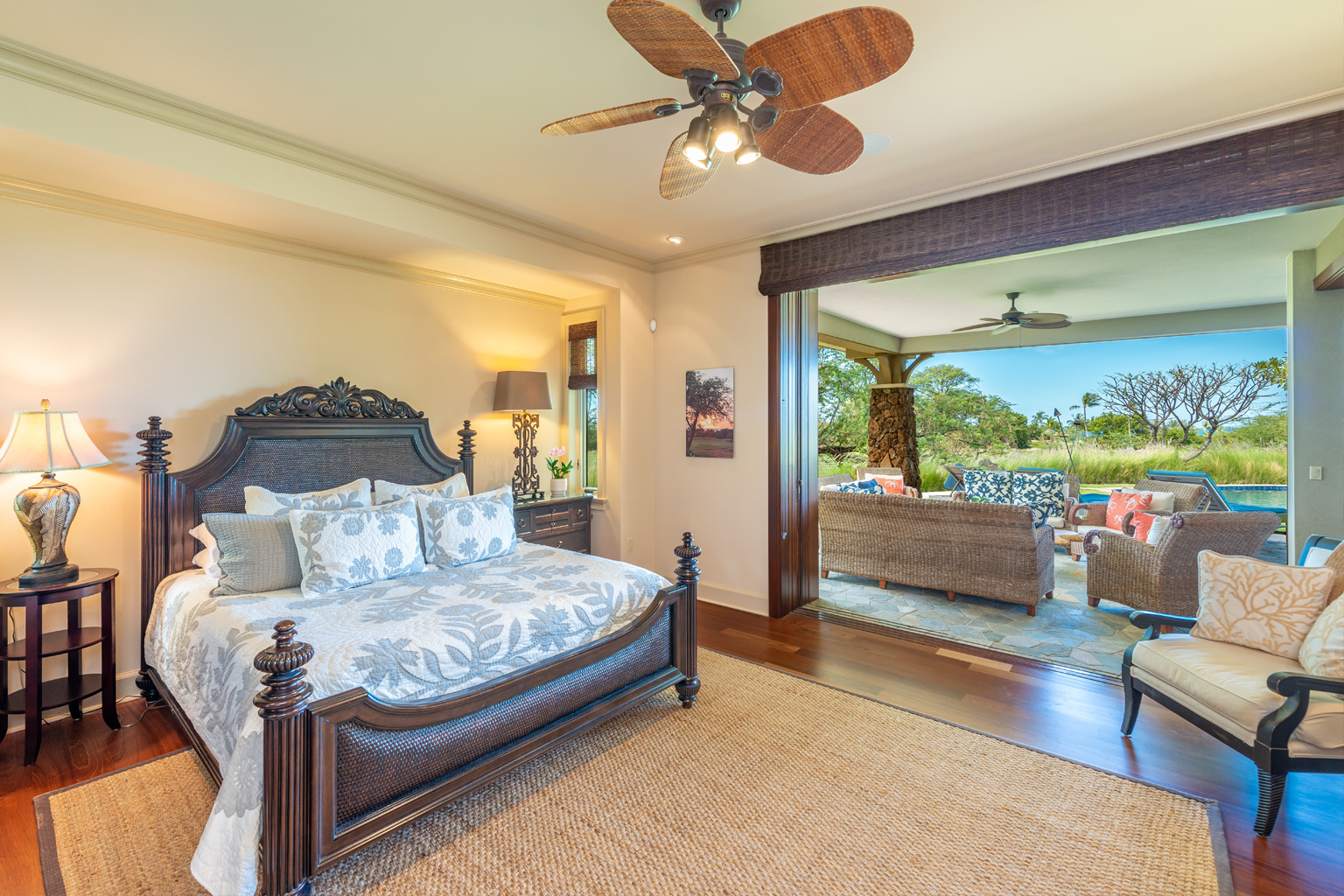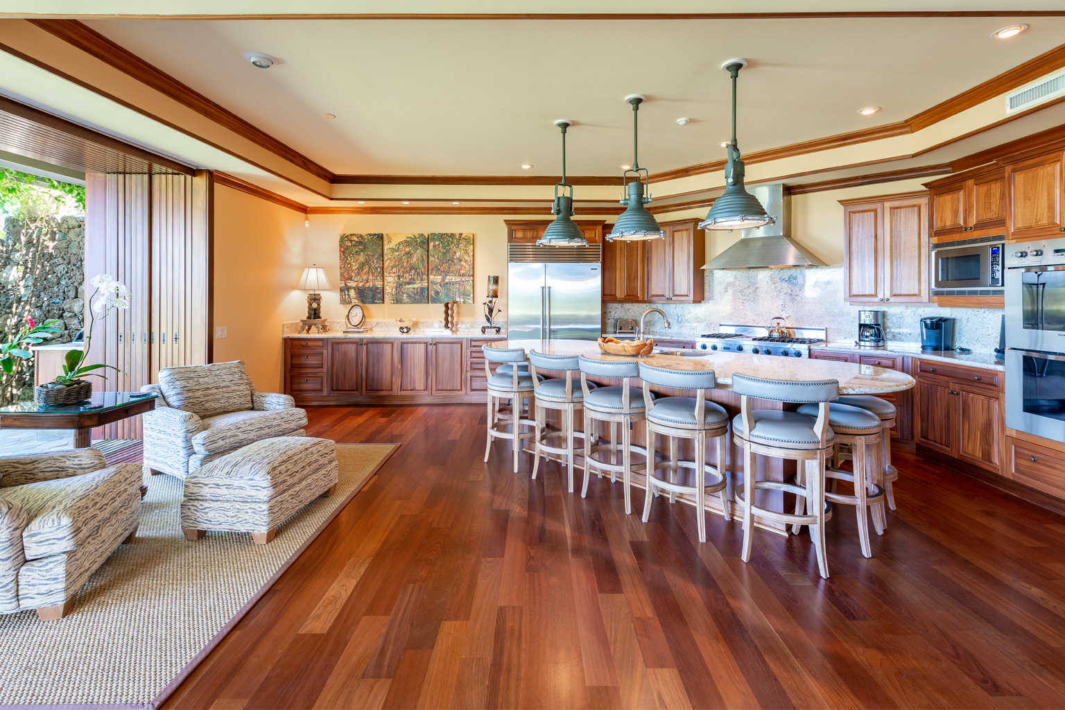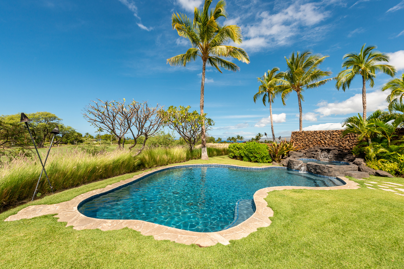 ゲートで守られた高級コミュニティの中にあるこのプライバシーを重視した至福の邸宅は、マホガニーの床材が美しいお部屋、一流アート作品、屋内外を一体化したハワイのライフスタイルを創り出すスライド ガラスドア、Viking製調理機器(ダブルオーブンを含む)を設えた食通にもご満足いただけるキッチン、そして8人掛けの大きなアイランド/ブレックファスト バーをご用意しております。その他4つのゲスト スイートルームがあり、そのうちのひとつには屋外シャワーとジェット水流付きバスタブ、空調とシーリングファン、ランドリールーム、プール、ジャグジー、端正なトロピカル庭園、そして屋外キッチン(バーベキューグリルと冷蔵庫)を配した屋根のある美しく調えられた家具付きラナイがあります。このレジデンスはマウナ ケアおよびハプナの世界に誇るビーチへ気軽に歩いて行ける距離。