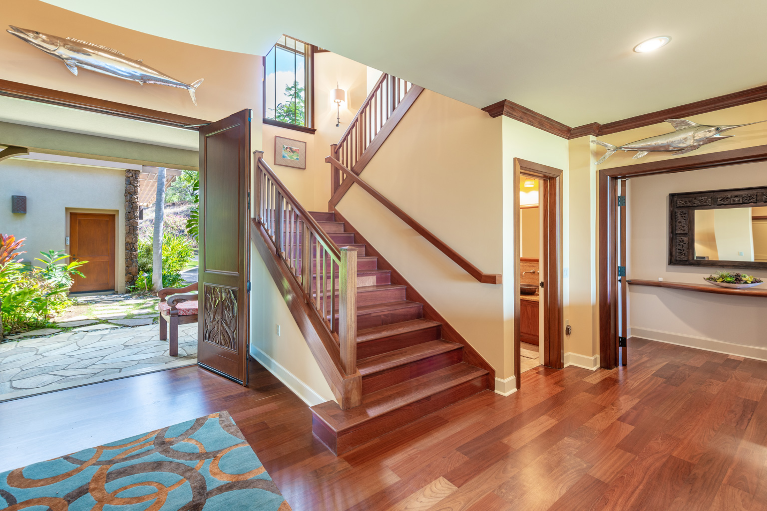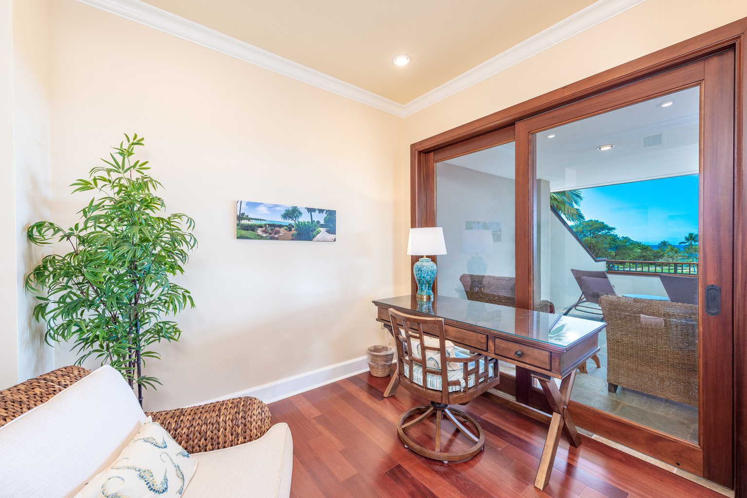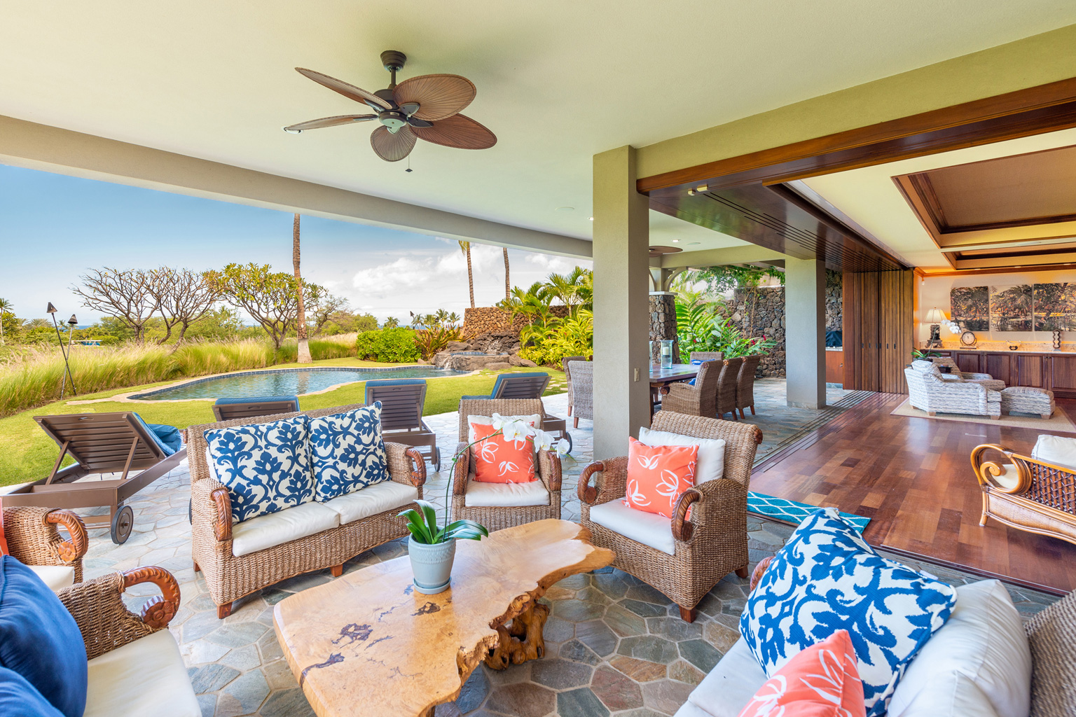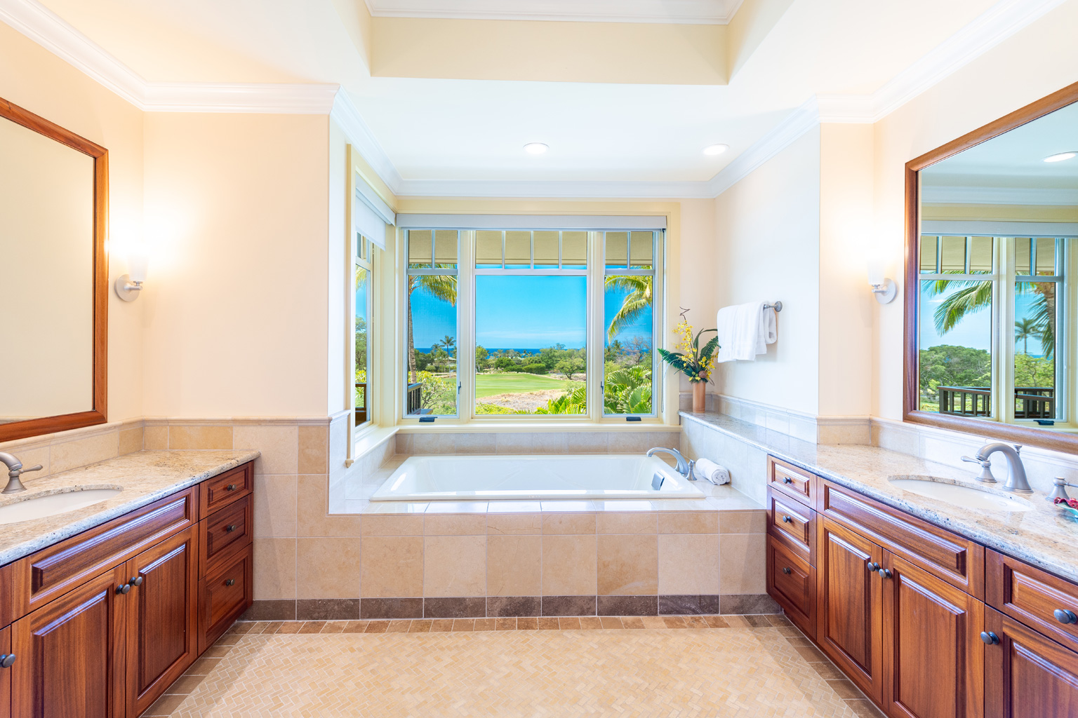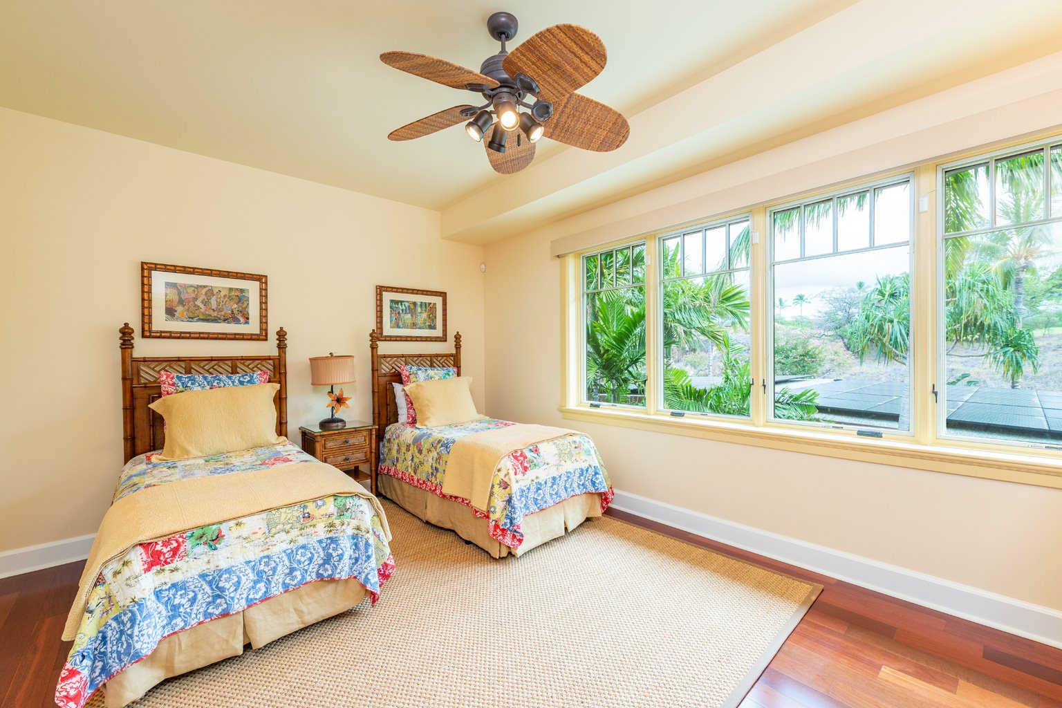ゲートで守られた高級コミュニティの中にあるこのプライバシーを重視した至福の邸宅は、マホガニーの床材が美しいお部屋、一流アート作品、屋内外を一体化したハワイのライフスタイルを創り出すスライド ガラスドア、Viking製調理機器(ダブルオーブンを含む)を設えた食通にもご満足いただけるキッチン、そして8人掛けの大きなアイランド/ブレックファスト バーをご用意しております。その他4つのゲスト スイートルームがあり、そのうちのひとつには屋外シャワーとジェット水流付きバスタブ、空調とシーリングファン、ランドリールーム、プール、ジャグジー、端正なトロピカル庭園、そして屋外キッチン(バーベキューグリルと冷蔵庫)を配した屋根のある美しく調えられた家具付きラナイがあります。このレジデンスはマウナ ケアおよびハプナの世界に誇るビーチへ気軽に歩いて行ける距離。