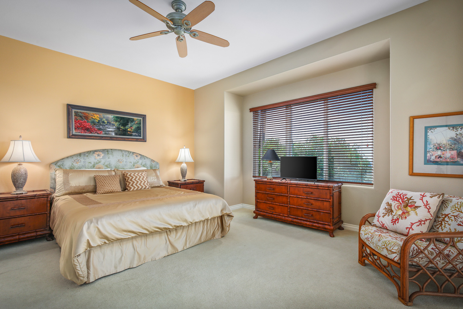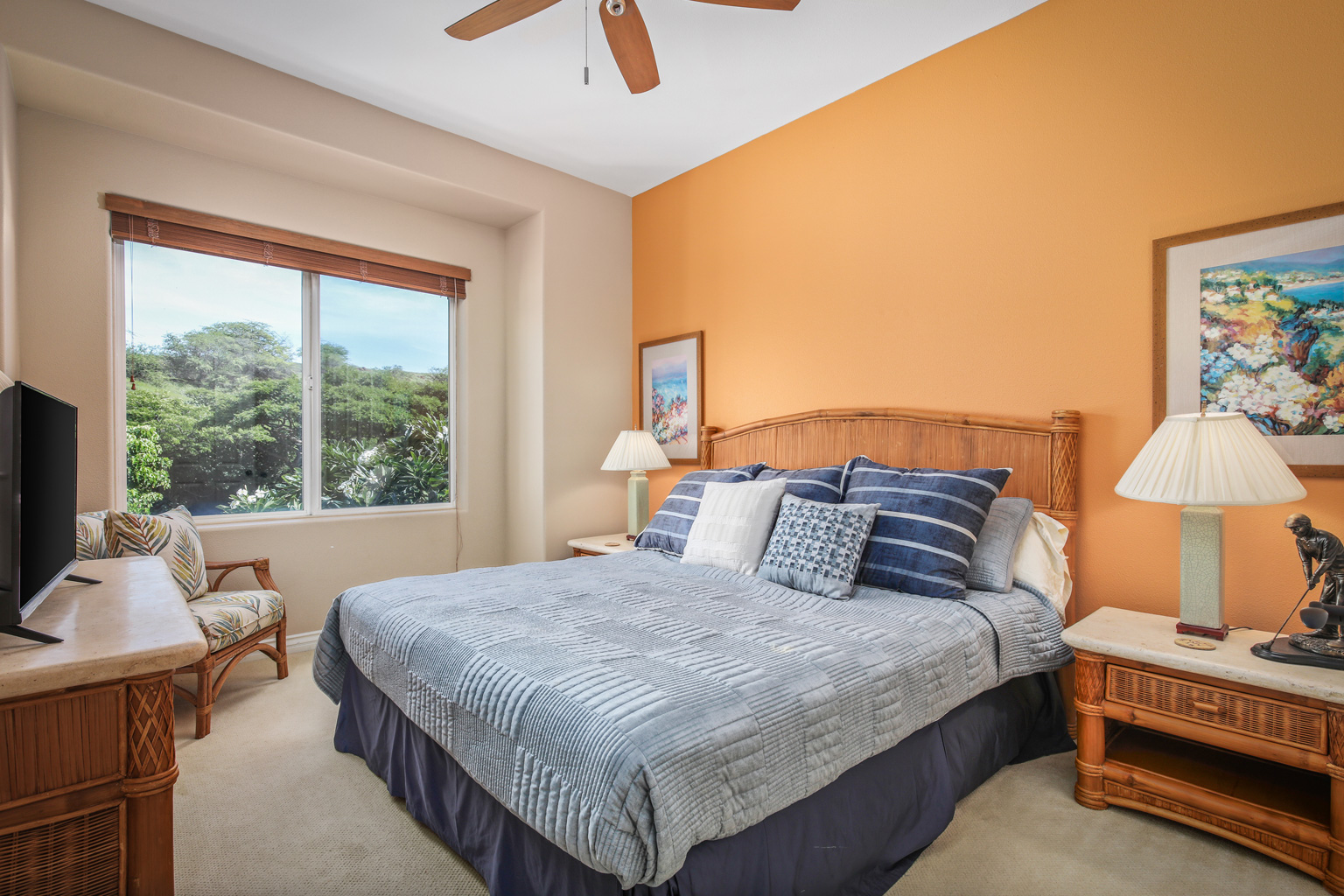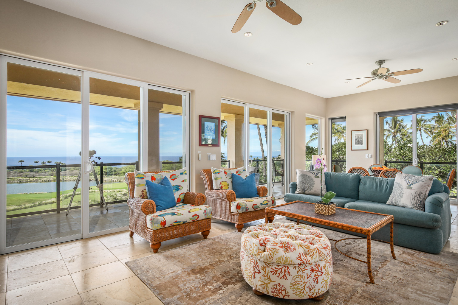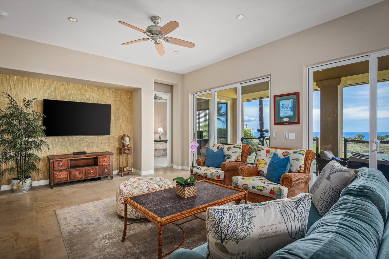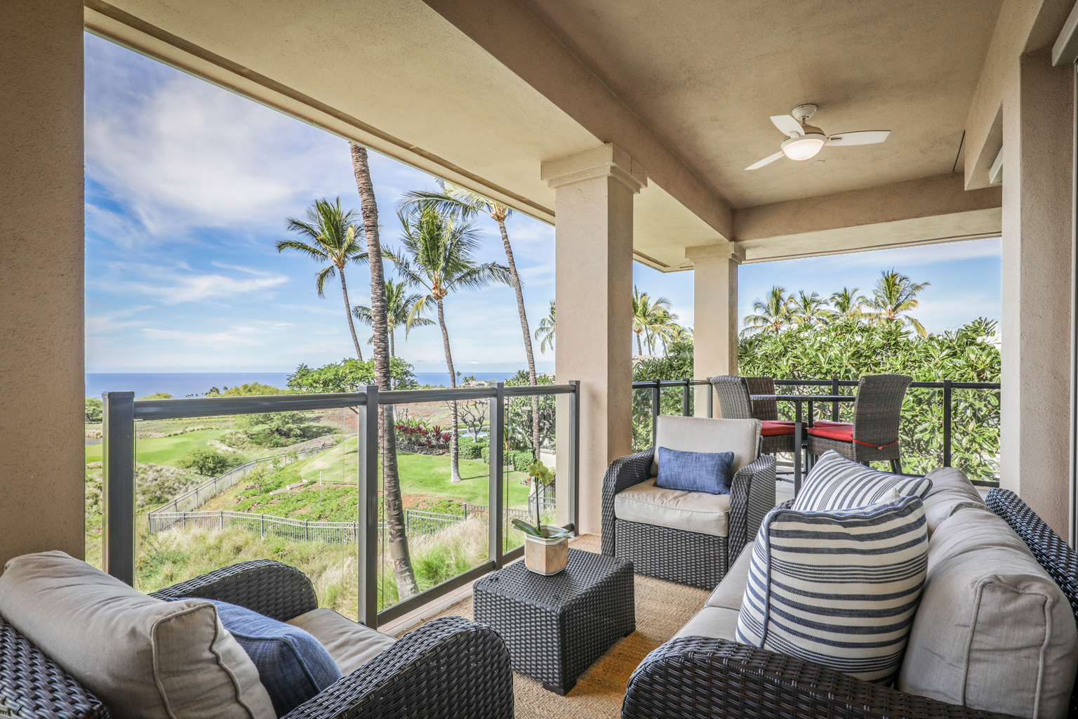 この2階に位置するオーシャンビュー レジデンスでは、屋内外を一体化するハワイのライフスタイルをご満喫いただけるスライド ガラスドアとスマート テレビのある大きいお部屋、ステンレス製高級家電を備えたシェフ キッチン、6人掛けのダイニング テーブルをご提供しています。その他、バスルームとカリフォルニア キングベッドを設えたゲスト スイートルーム、キングベッドのあるベッドルーム、スライド ドアとソファベッドのあるボーナスルーム、空調とシーリングファン、洗濯機と乾燥機もご用意。このレジデンスは海から約1マイルの場所にあります。