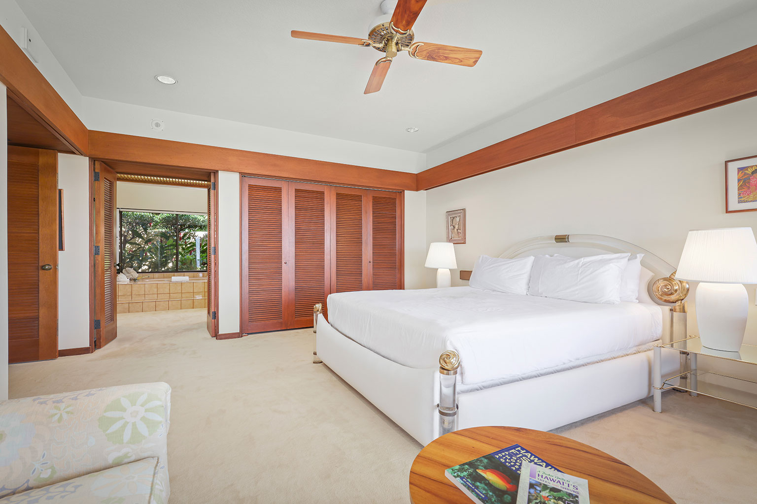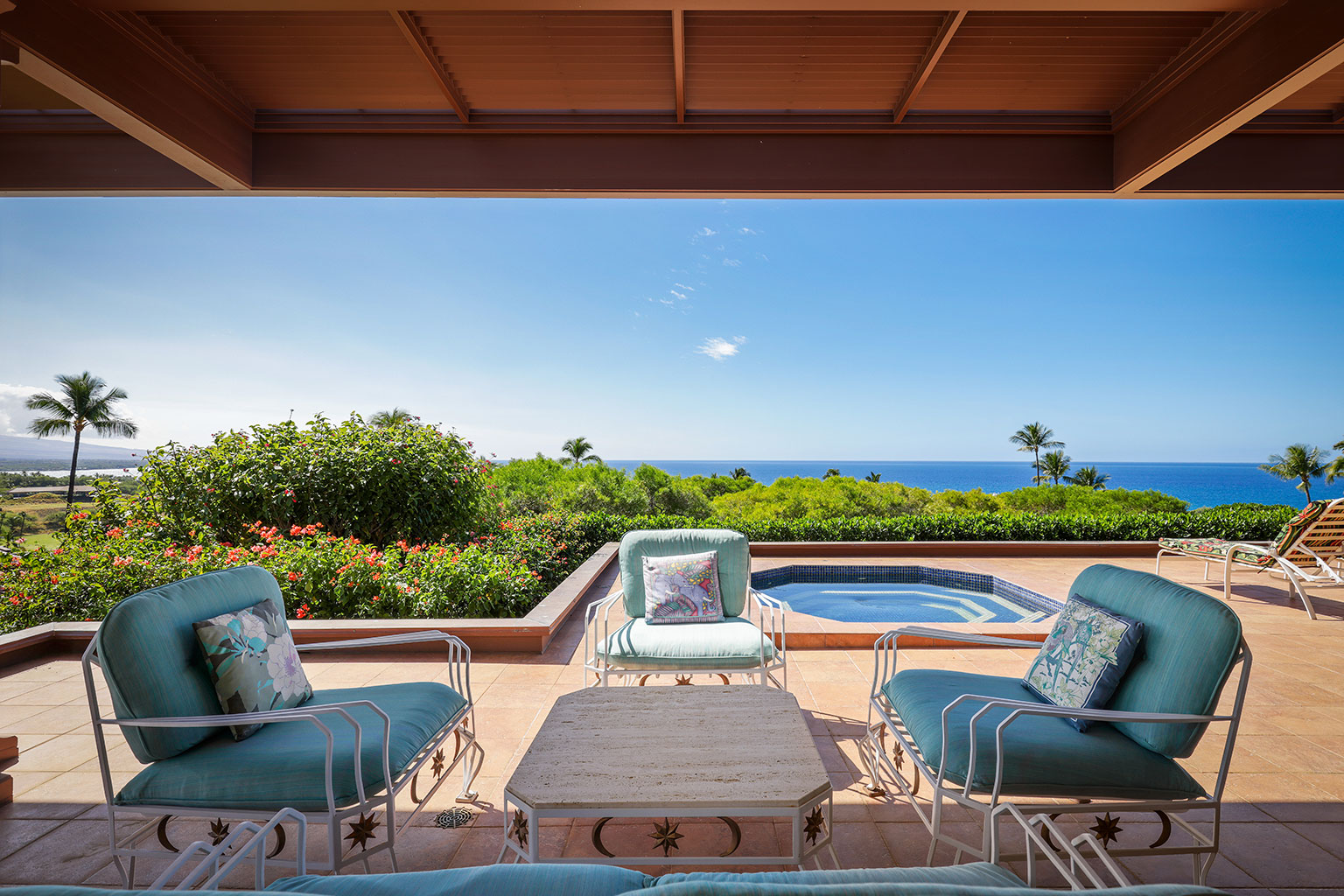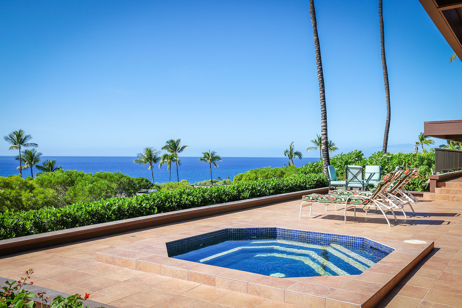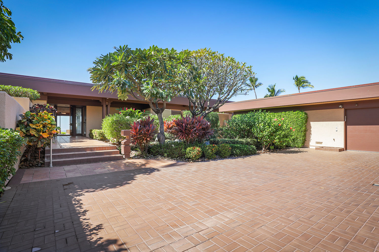 この豪奢な一階建てのオーシャンフロント邸宅には、南国の植物が植えられたプライベートコートヤード(庭)が付いています。サンクン リビングにはポケット・スライディングドアがあり、ドアを開けると屋内外が繋がり広い空間を楽しめます。まだウェットバー、大きなアイランド付きのフルキッチン、最大6名で利用できるダイニングエリアがあります。ゲストスイート2室、うち1室にはバスルームが併設されています。プライマリースイートにはカリフォルニアキングベッド1台、セカンダリースイートにはダブルベッド2台とワーク用デスクが入っています。エアコン、シーリングファン、ランドリールーム完備。ビーチ、ゴルフコース、マウナ ケア ビーチホテルから徒歩で10分というロケーションにあります。