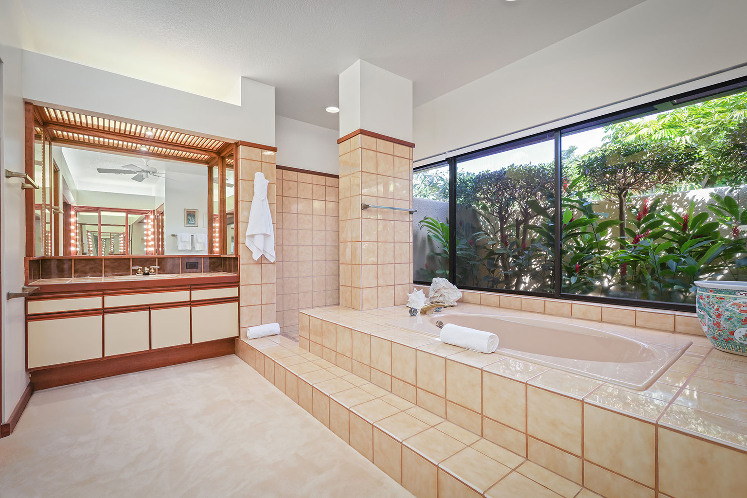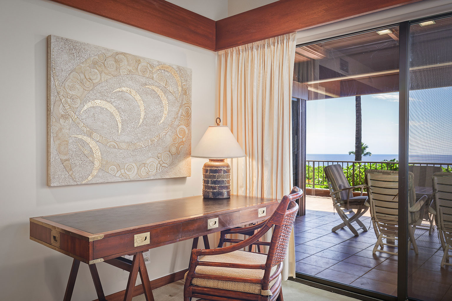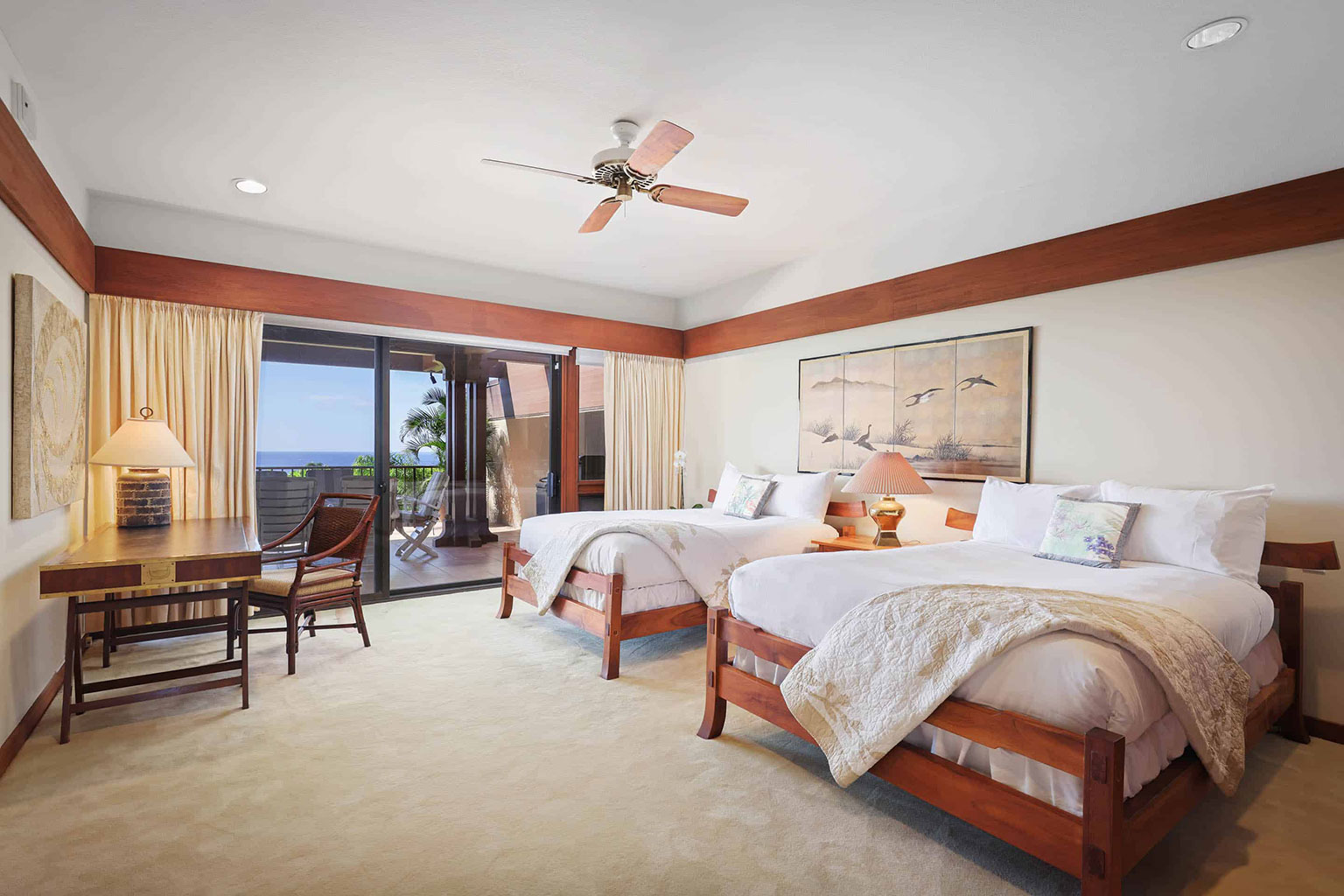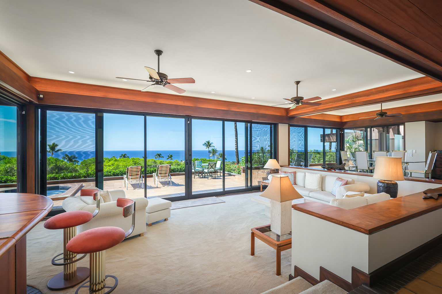 この豪奢な一階建てのオーシャンフロント邸宅には、南国の植物が植えられたプライベートコートヤード(庭)が付いています。サンクン リビングにはポケット・スライディングドアがあり、ドアを開けると屋内外が繋がり広い空間を楽しめます。まだウェットバー、大きなアイランド付きのフルキッチン、最大6名で利用できるダイニングエリアがあります。ゲストスイート2室、うち1室にはバスルームが併設されています。プライマリースイートにはカリフォルニアキングベッド1台、セカンダリースイートにはダブルベッド2台とワーク用デスクが入っています。エアコン、シーリングファン、ランドリールーム完備。ビーチ、ゴルフコース、マウナ ケア ビーチホテルから徒歩で10分というロケーションにあります。