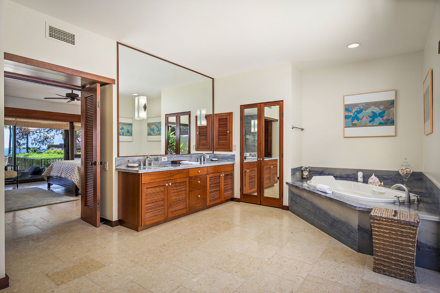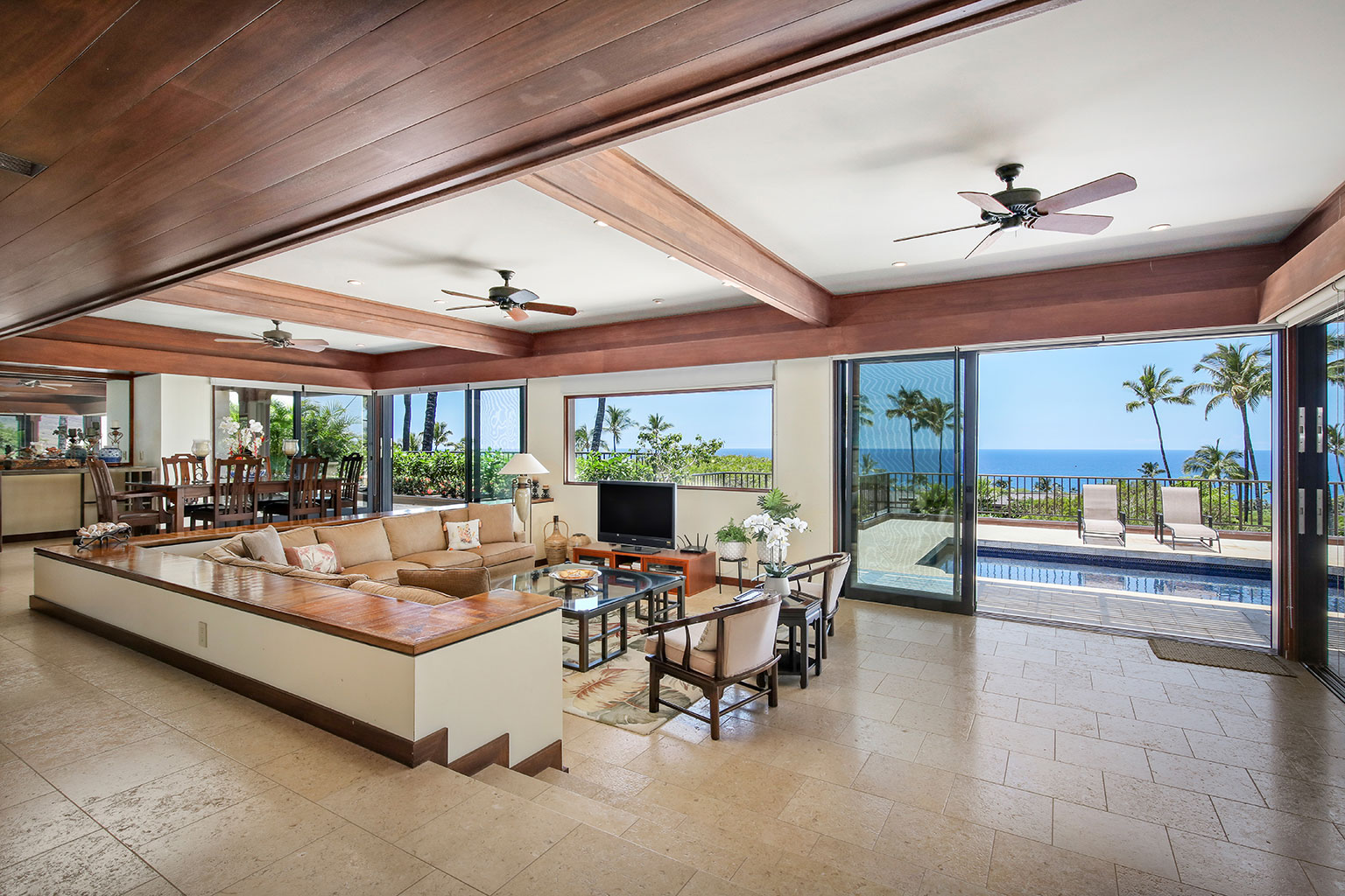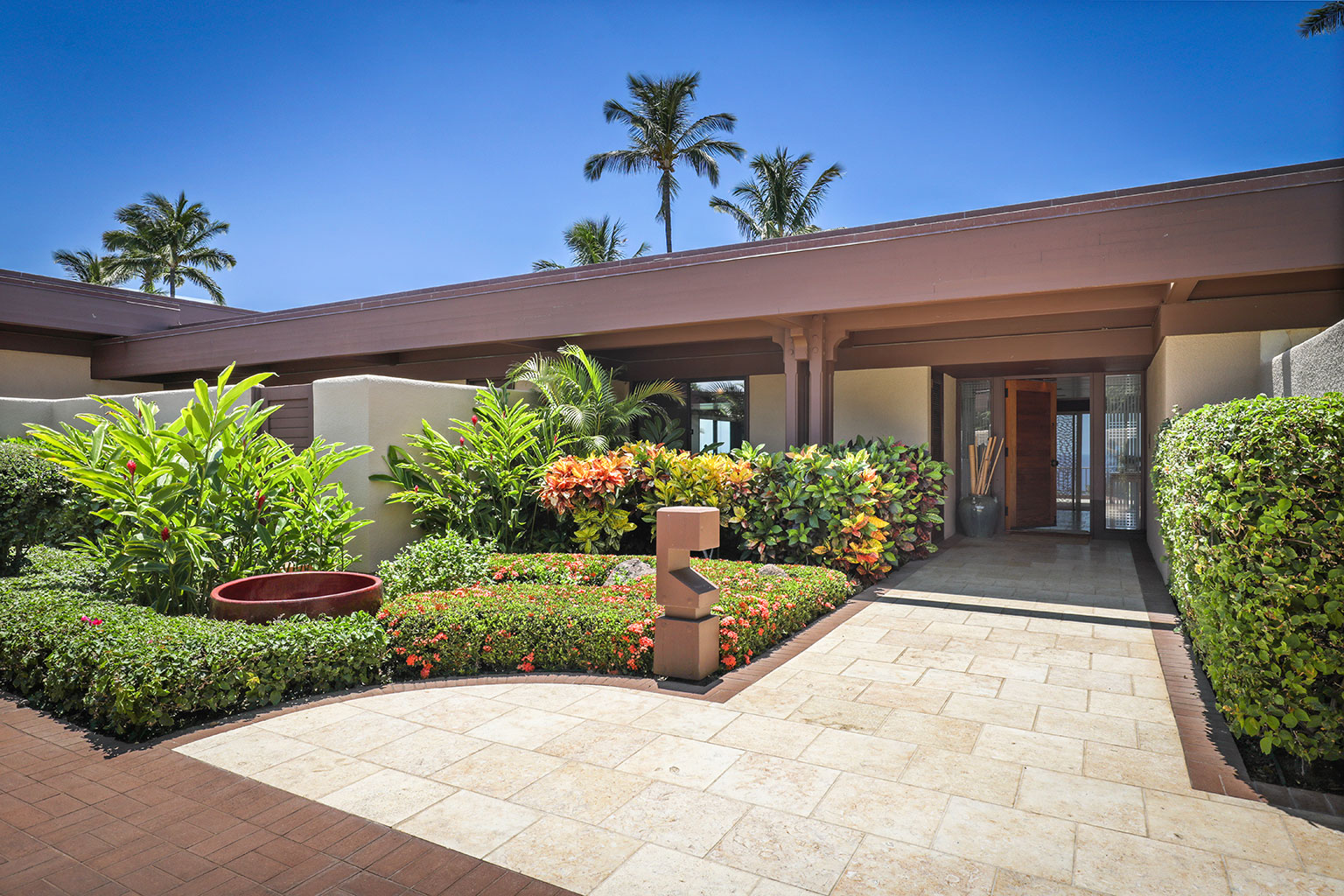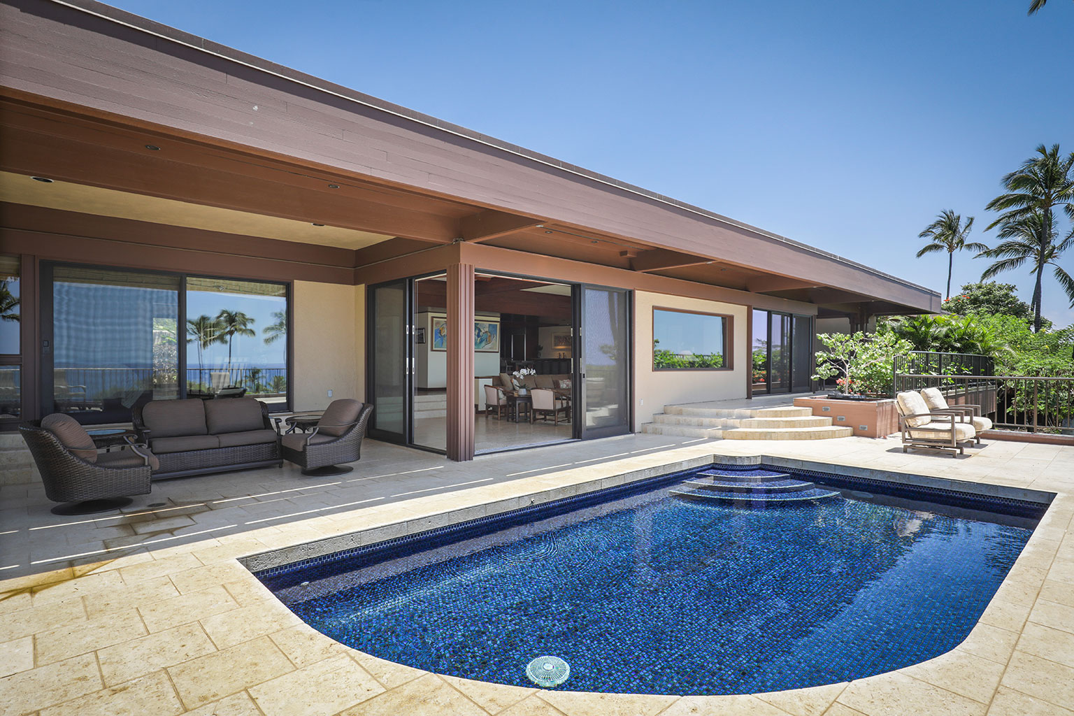 この1階建てのオーシャンフロントの邸宅には、ハワイのライフスタイルにぴったりなスライド ガラスドアが屋内と屋外のスペースを一体化する段差のあるサンクン ルーム、ダイニング エリアが2か所、キングベッド1台があるプライマリーマスタースイートルームがあります。プライマリースイートルームにはバスタブのあるバスルームが付随しています。ゲストルームは2室(1室はクイーンベッド2台、もう1室はクイーンベッド1台)です。その他の施設としては、ランドリールーム、エアコンとシーリングファン、ウェットバー、屋外シャワー、プライベートプール、ジャグジー、BBQグリルと家具が備わったラナイがあり、駐車場は車2台を停められます。ビーチ、ゴルフコース、マウナ ケア ビーチ ホテルまで徒歩10分のところにあります。