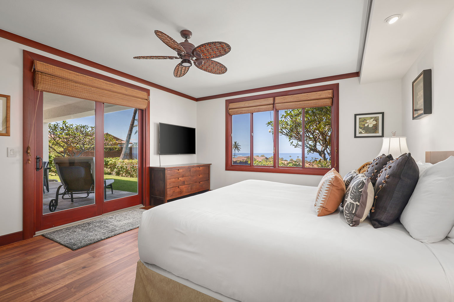地上1階角部屋のこのオーシャンビュー・レジデンスは、ガラス窓にポケットドアシステムを採用し、リビングエリアは窓を開けた時に屋内と屋外スペースが一体化するようになっています。プロ仕様のキッチンにはステンレス製のガスレンジと電化製品を導入しています。マスタースイートルームにはテンピュール®マットレスのキングベッドが1台、ジュニアマスタールームにはテンピュール®マットレスのツインXLベッドが2台(合わせて利用するとキングベッド1台になります)が入っています。エアコン、シーリングファン、洗濯機/乾燥機、車1台分の駐車場完備。