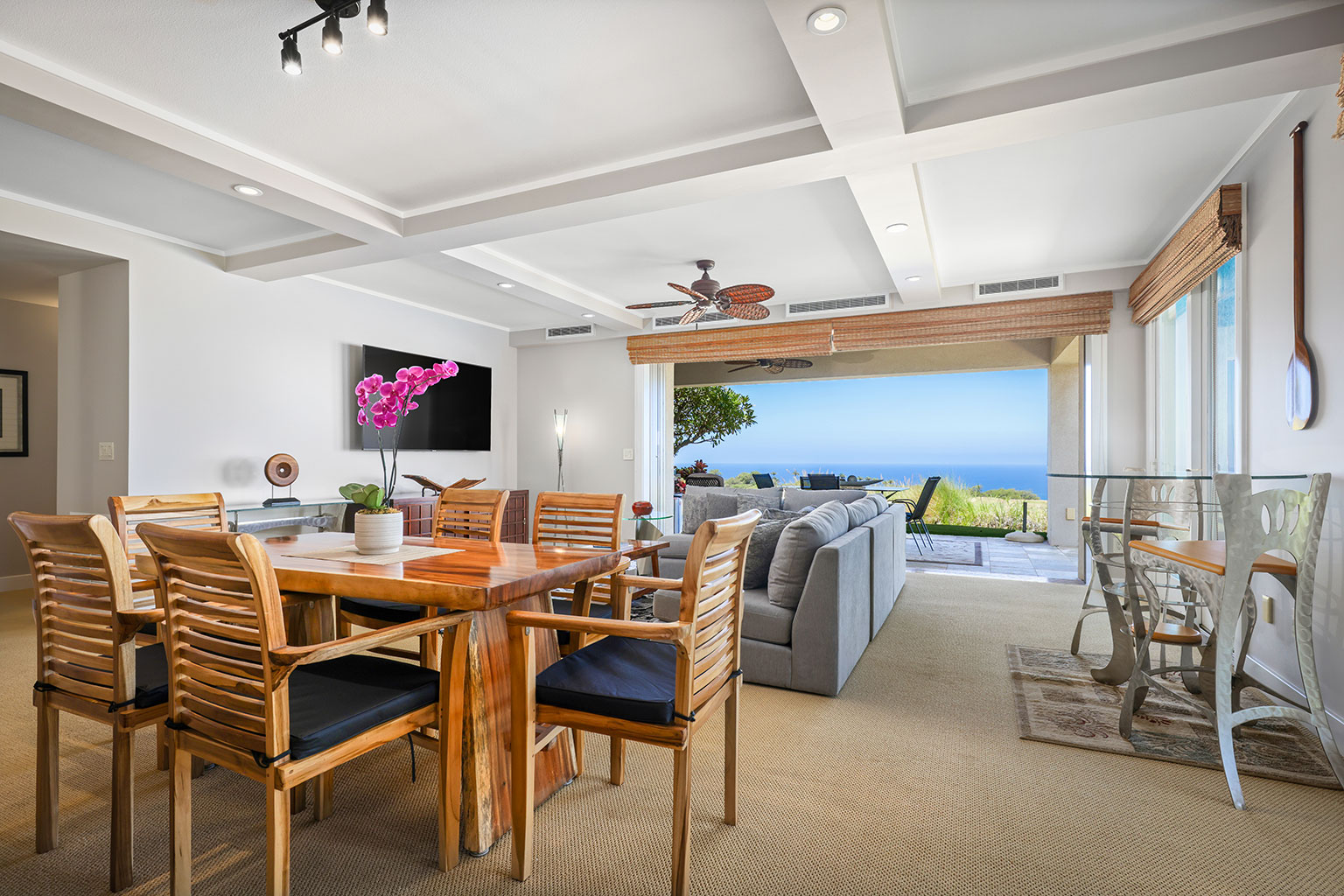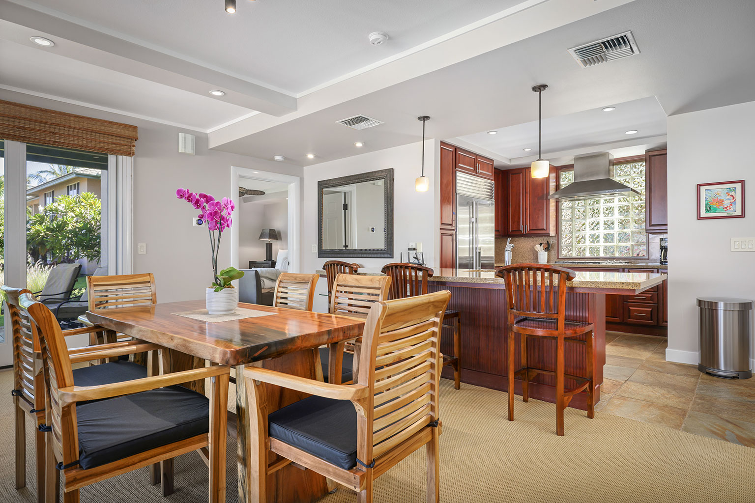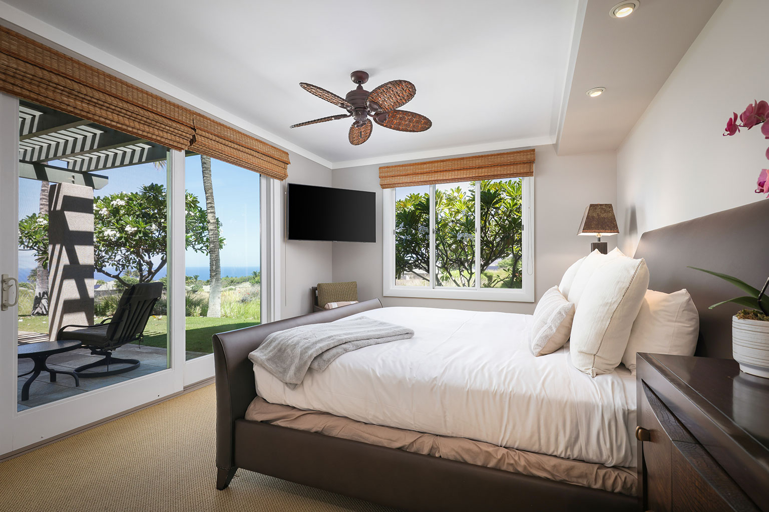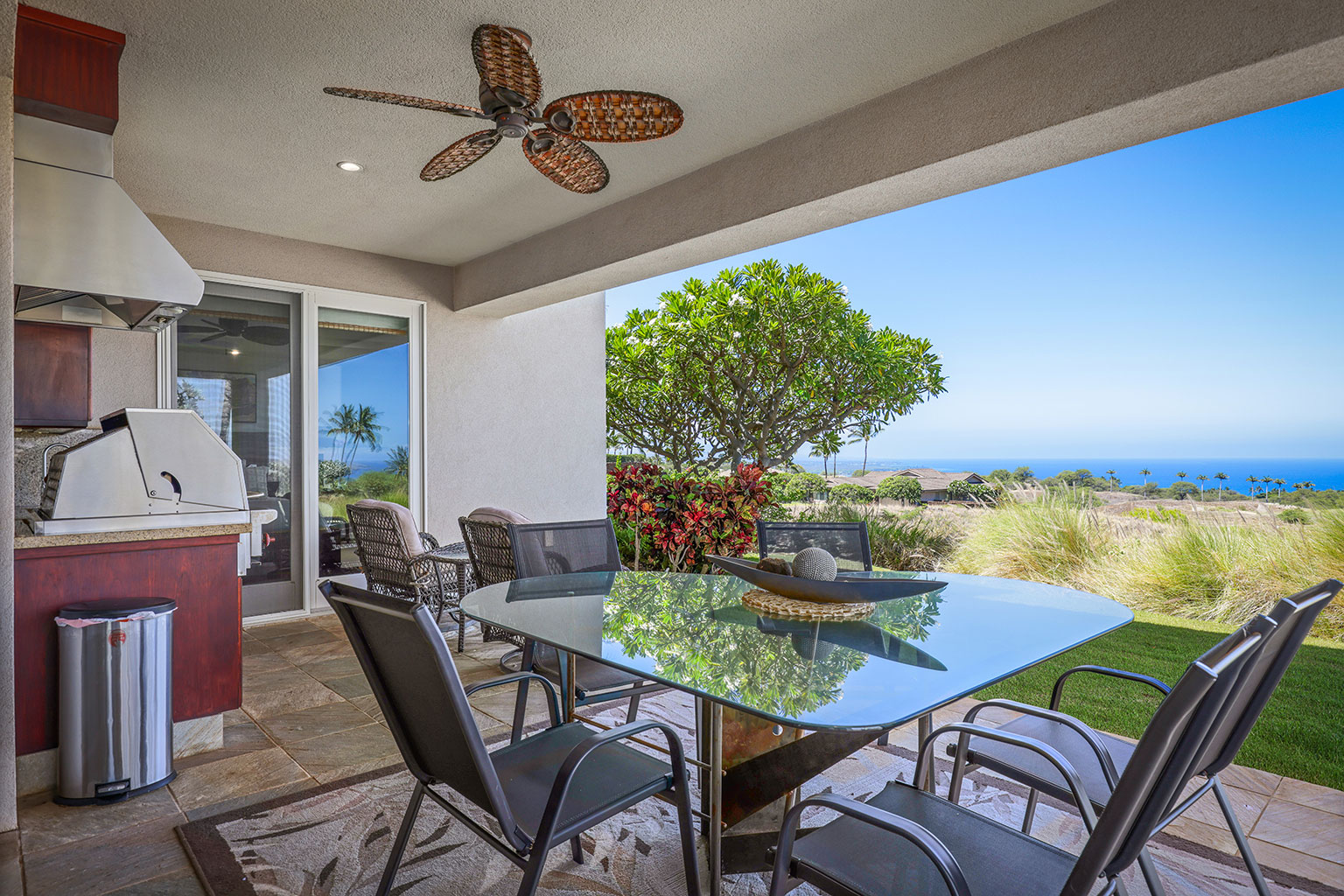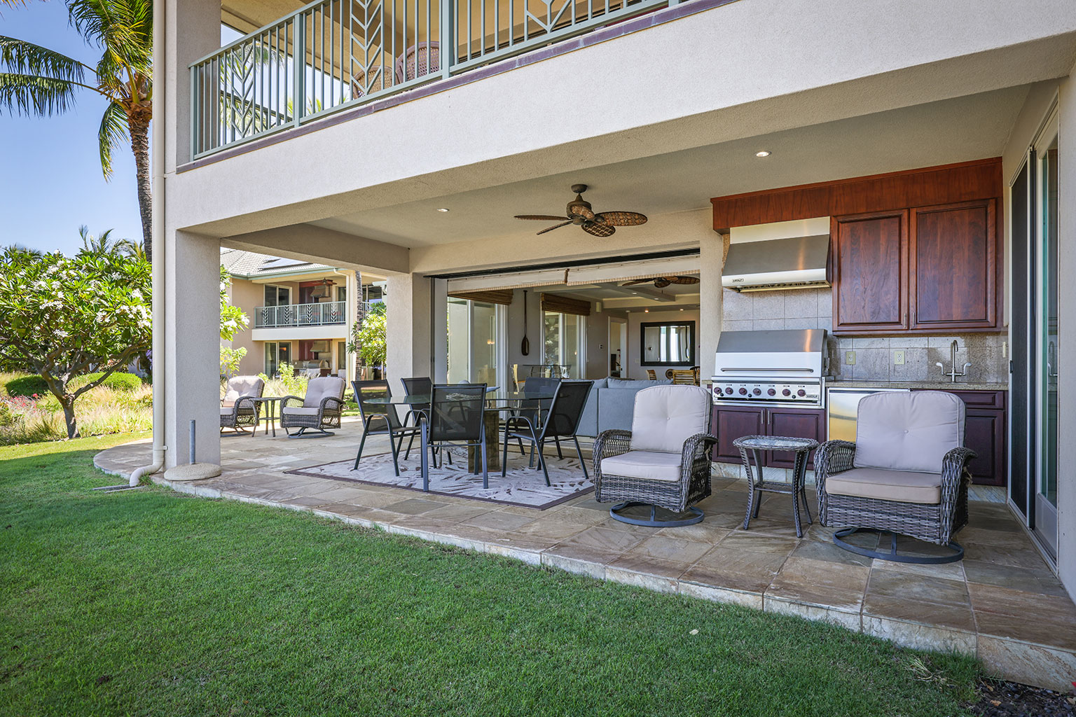 ラナイには、家具およびWolf製アウトドアキッチン(BBQグリル、冷蔵庫)が備わっています。