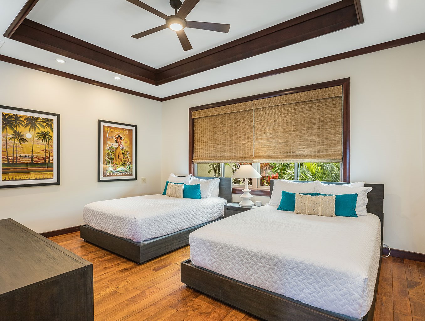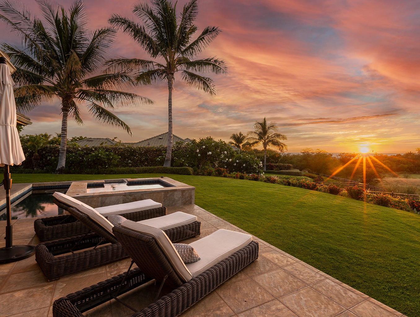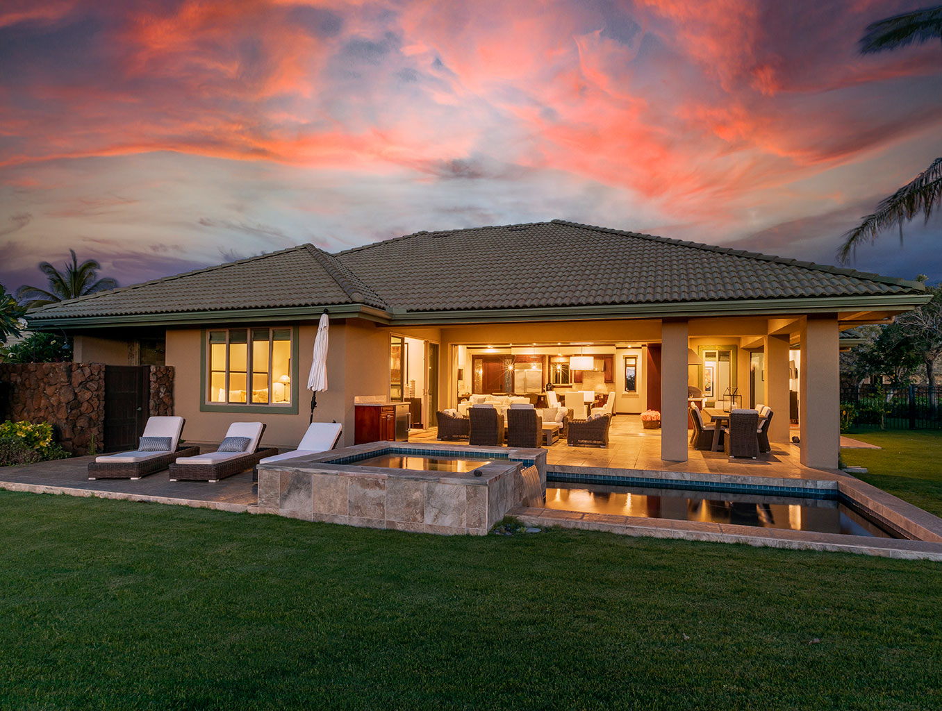 この他、薄型テレビや豪華な専用バスルーム、広々としたウォークイン クローゼットを設えた3つのゲスト スイートルーム(プライマリーとセカンダリー スイートにはキングサイズのベッド1台と屋外シャワーとダブル洗面台、3つ目のスイートにはクイーンサイズのベッド2台)、エアコン、シーリングファン、ランドリールーム、ハワイの静かな夕陽を望むプライベートなプランジプール、ジャグジー、屋外キッチンやダイニングテーブル、ラウンジ家具を備えた屋根付きのラナイもあります。このレジデンスは海から1マイルの場所にあります。