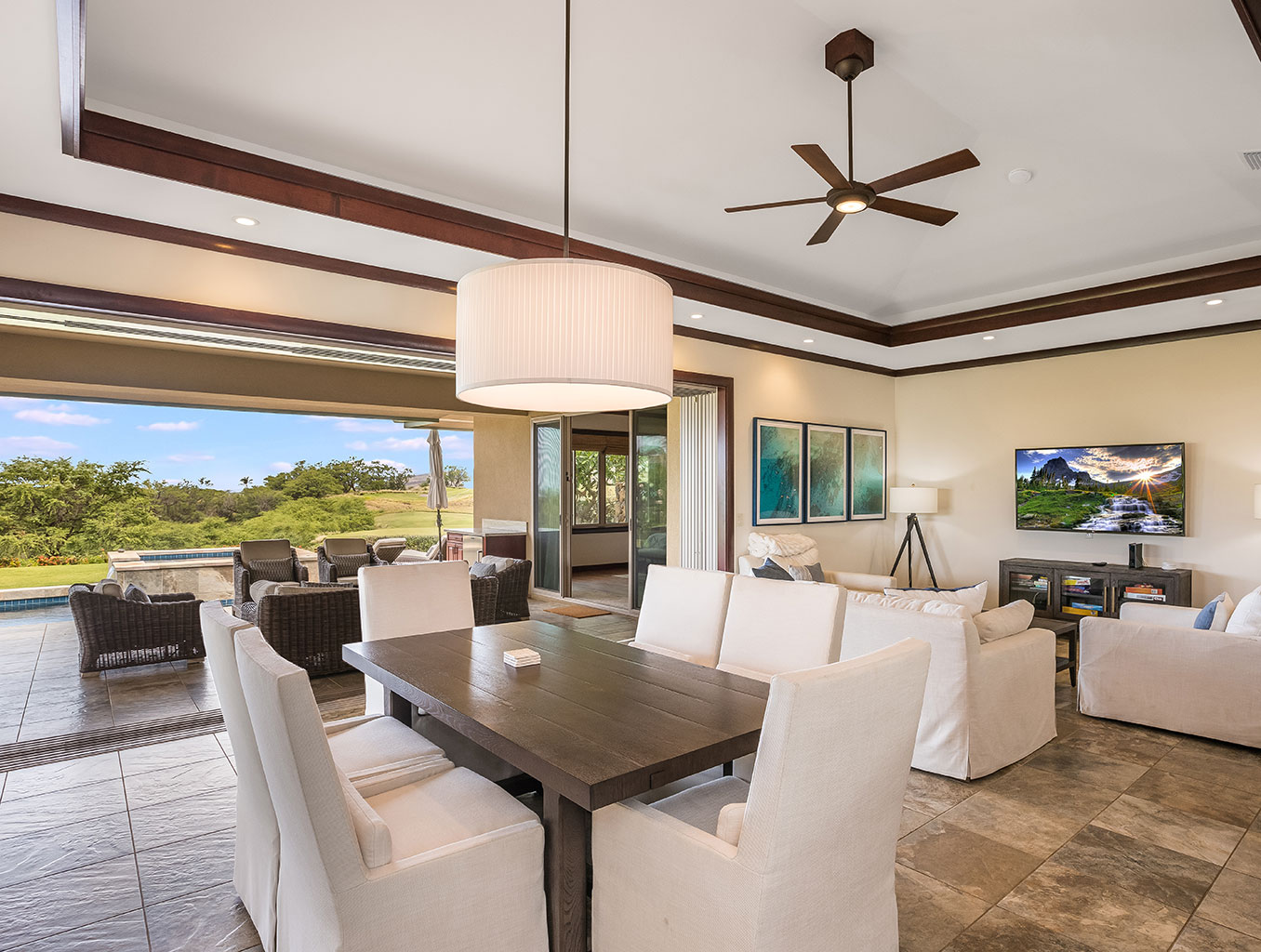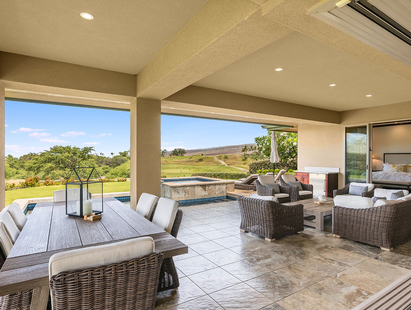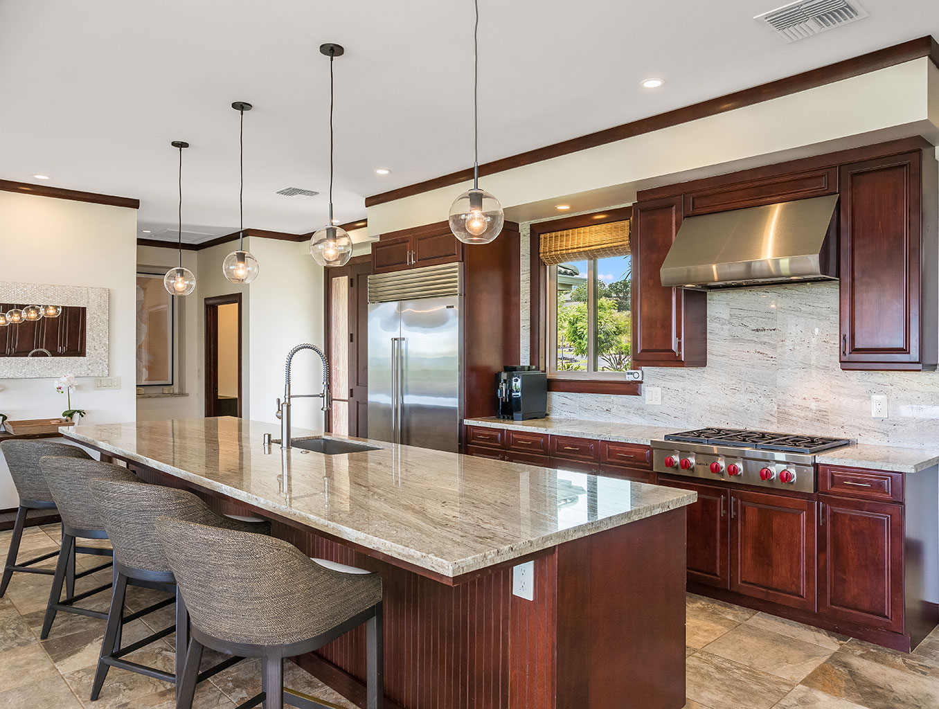 細部にこだわったこのオーシャンビューのアップカントリーなヴィラでは、屋内外を一体化するハワイのライフスタイルを創り出すスライド式のポケットドアのある心地よい空間、花崗岩のカウンタートップやワイン用冷蔵庫を含むプレミアムステンレス製調理機器をそろえたグルメなキッチン、6人用のダイニングテーブルをご提供しております。