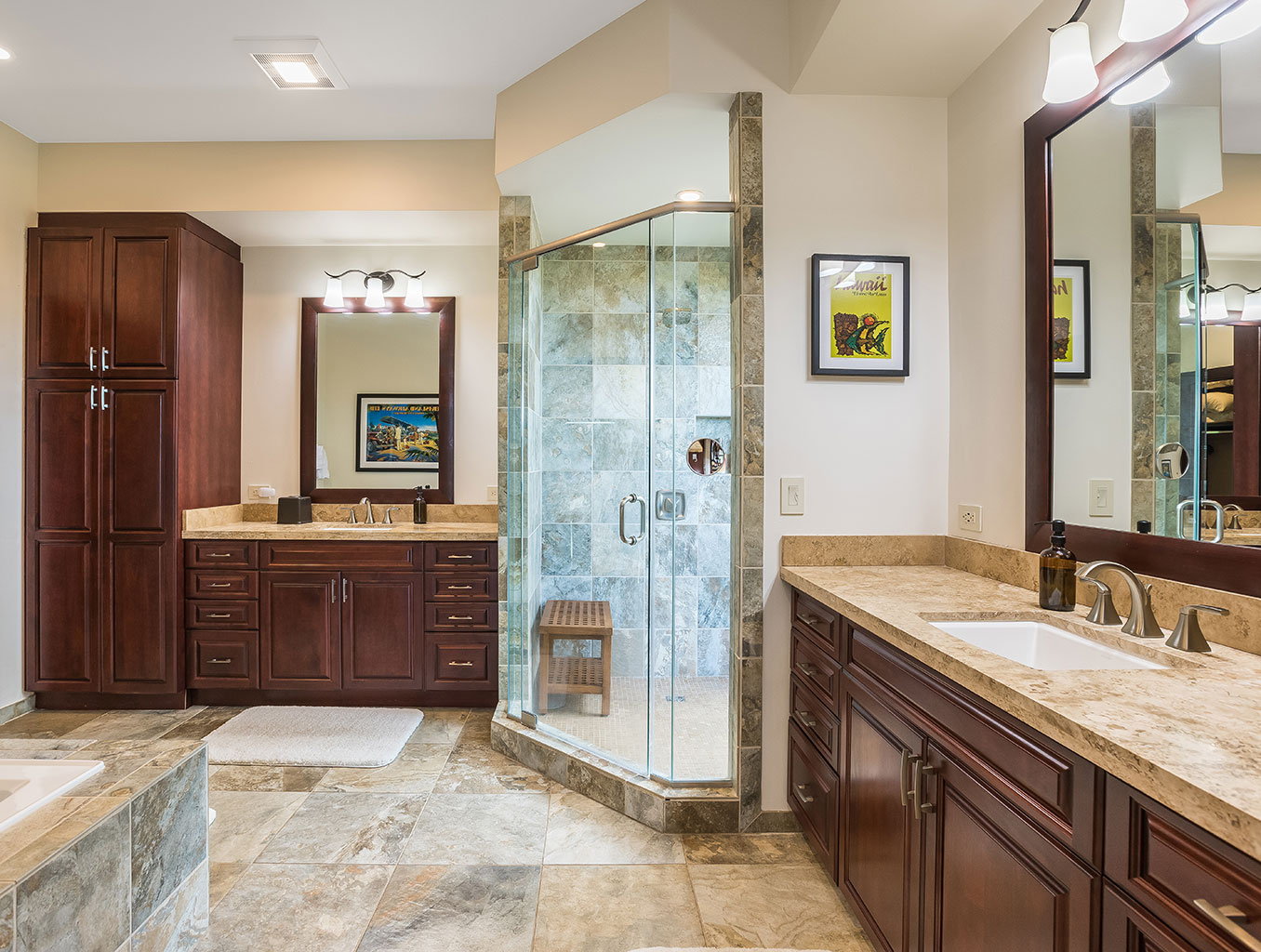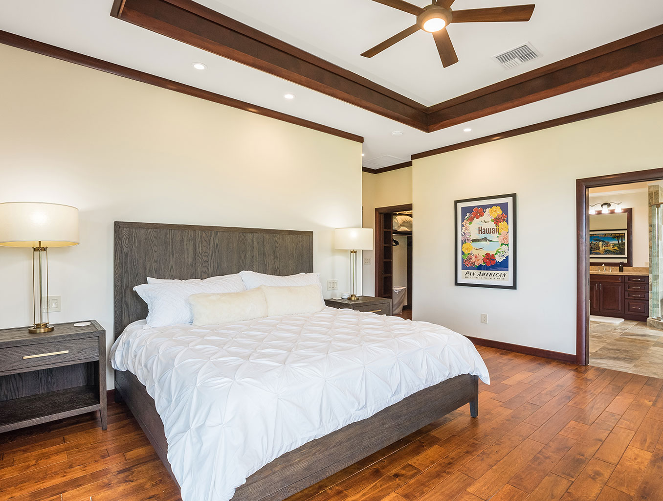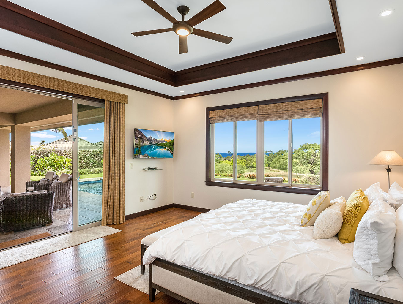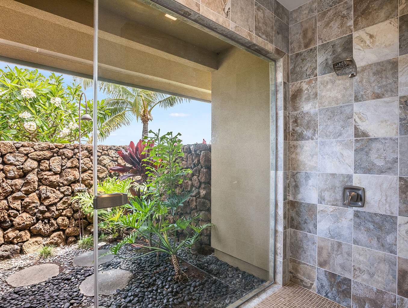 細部にこだわったこのオーシャンビューのアップカントリーなヴィラでは、屋内外を一体化するハワイのライフスタイルを創り出すスライド式のポケットドアのある心地よい空間、花崗岩のカウンタートップやワイン用冷蔵庫を含むプレミアムステンレス製調理機器をそろえたグルメなキッチン、6人用のダイニングテーブルをご提供しております。