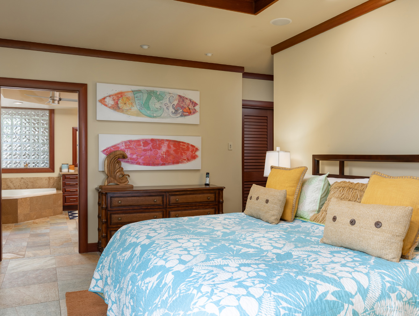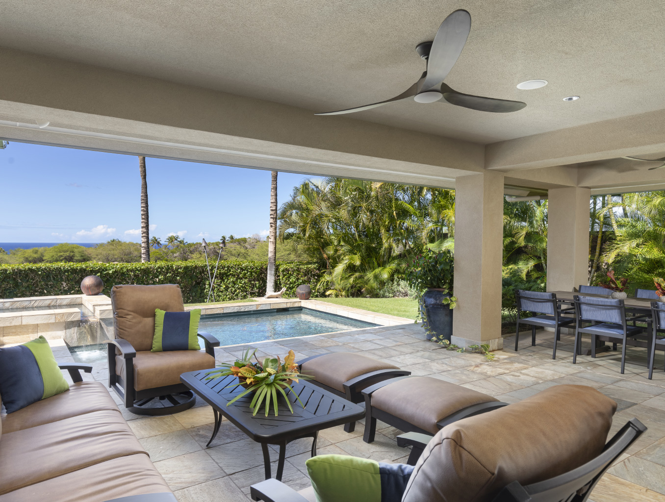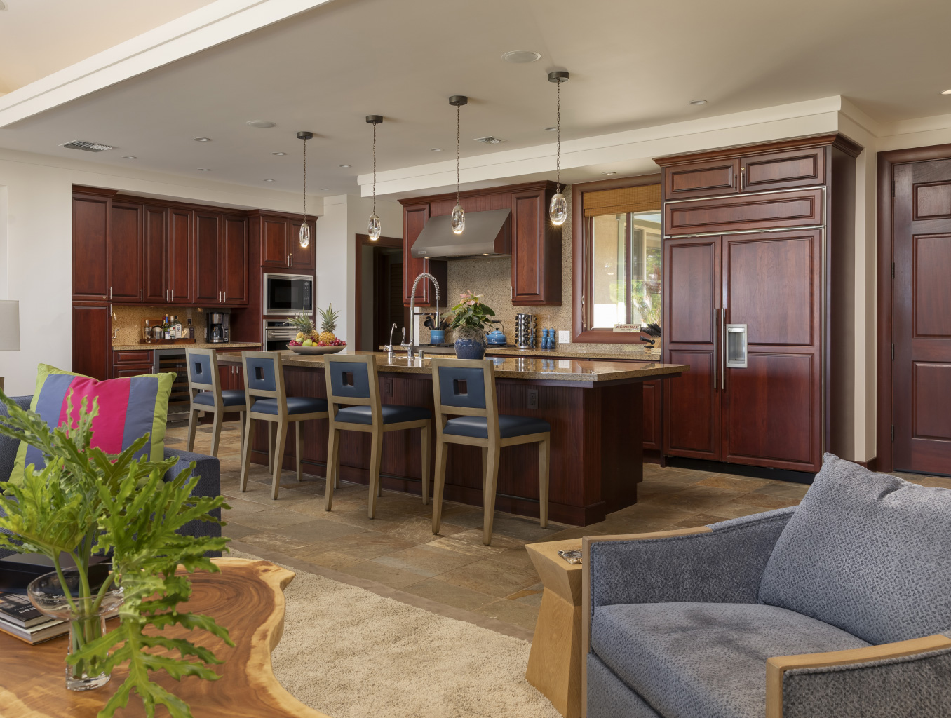 室内に一歩踏み入れるとアロハを感じる心地よい空間が広がる、細部にこだわったこのオーシャンビューのアップカントリーなヴィラでは、華やかなアートワークのコレクションや洗練されたアイランドスタイルの家具、屋内外を一体化するハワイのライフスタイルを創り出すスライド式のポケットドアのある心地よい空間、花崗岩のカウンタートップ、ダブルオーブンやワイン用冷蔵庫を含むWolf製およびSub-Zero製調理機器をそろえたグルメなキッチン、6人用のダイニングテーブルをご提供しております。