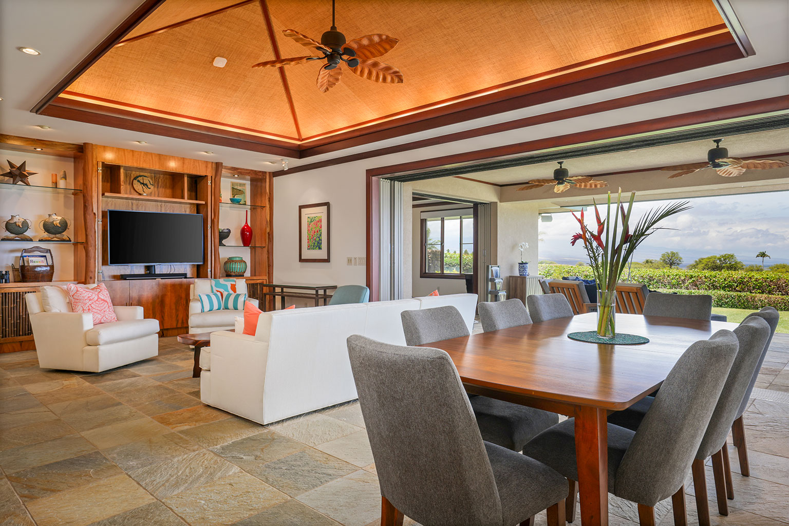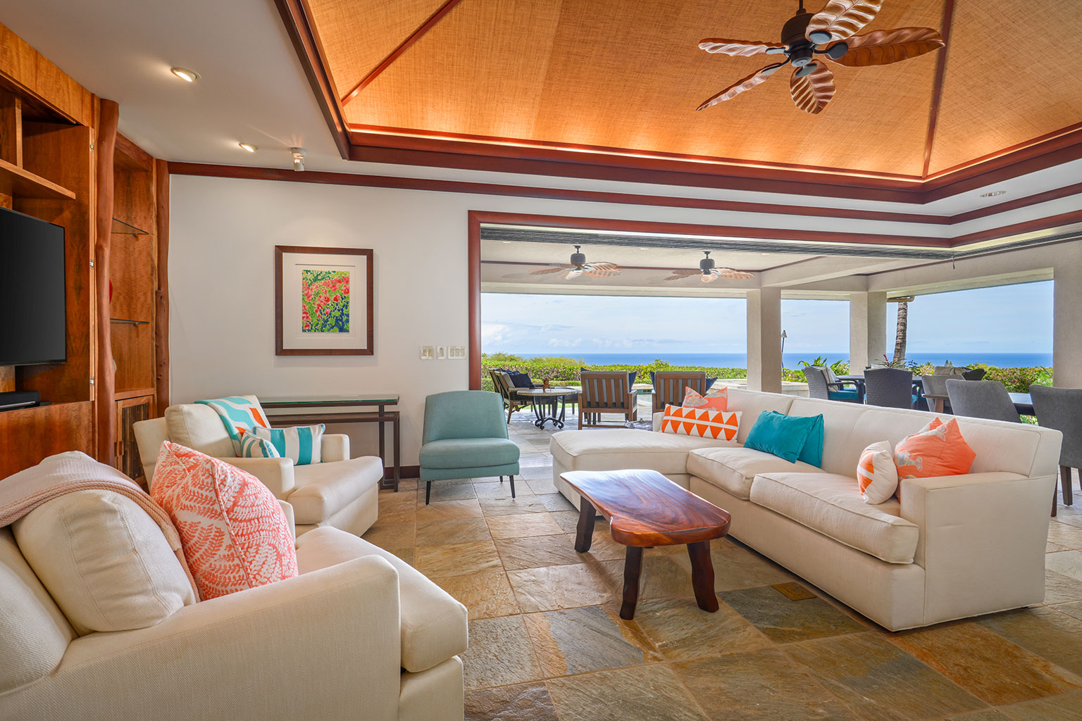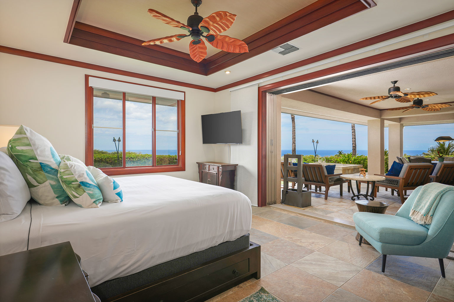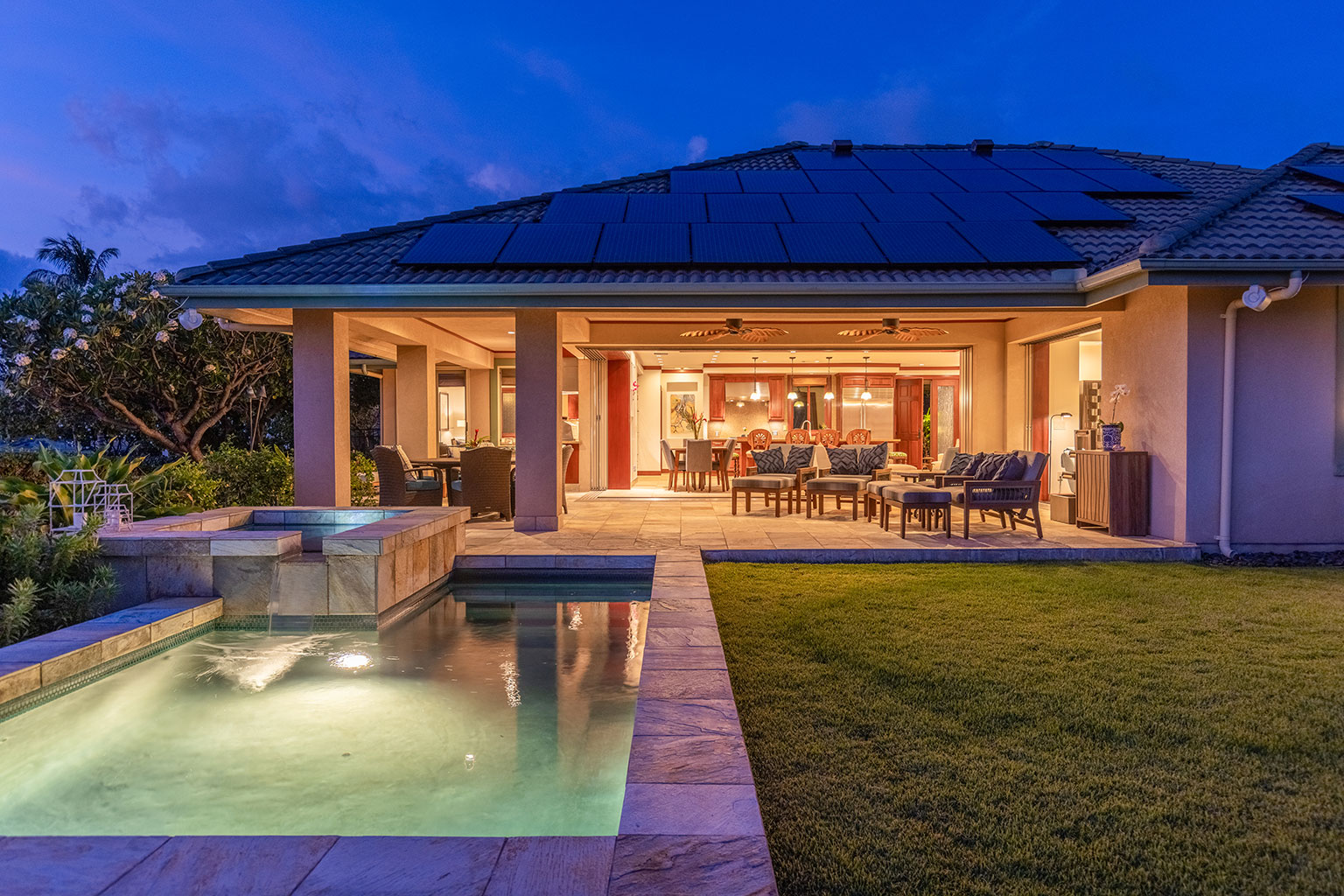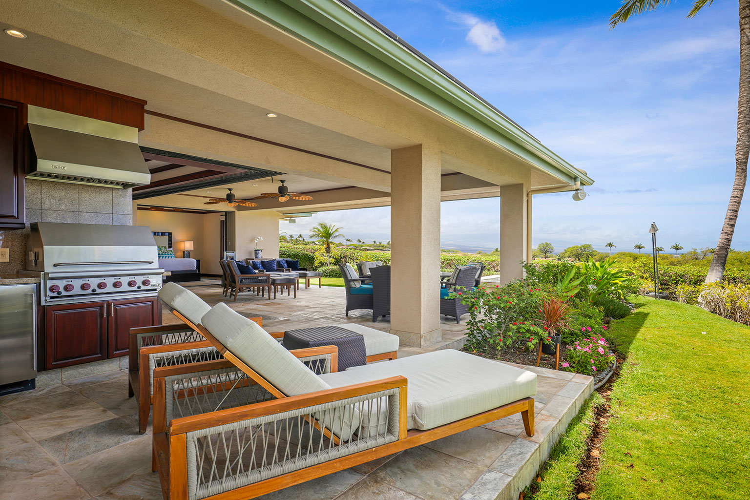 名高いマウナケア・リゾートの高台に佇むこの豪華な邸宅は、コハラコーストを一望する壮大なパノラマビューを誇り、空を美しく染める見事な夕陽をご覧いただけます。リビングエリアは屋外、屋内を意識せずくつろげるように設計されています。屋根付きのラナイ(ベランダ)は広々としており、使い心地のよいラウンジチェアに横たわり、海からの爽やかな風に包まれて時間を過ごすのにぴったりです。屋内の豪華なリビングルームは、心安らぐ空間です。装備の充実したキッチン、最大8人で利用できる広いダイニングエリア、また8人分のお席のあるバーエリアも備わっております。寝室は3部屋あり、いずれのお部屋にもキングベッドが1台入っていて、バスルームも併設されています。プライマリースイートにはスパ施設のようなジャグジータブ、プライベート屋外シャワー、そして贅沢な作りのウォークインクローゼットがあります。宿泊に柔軟な対応ができるよう、3部屋目の寝室にはキングベッド1台の他に、クイーンサイズのマーフィーベッドをご用意しております。その他、ランドリールーム、エアコン、シーリングファン、プライベートプール、ホットタブもございます。