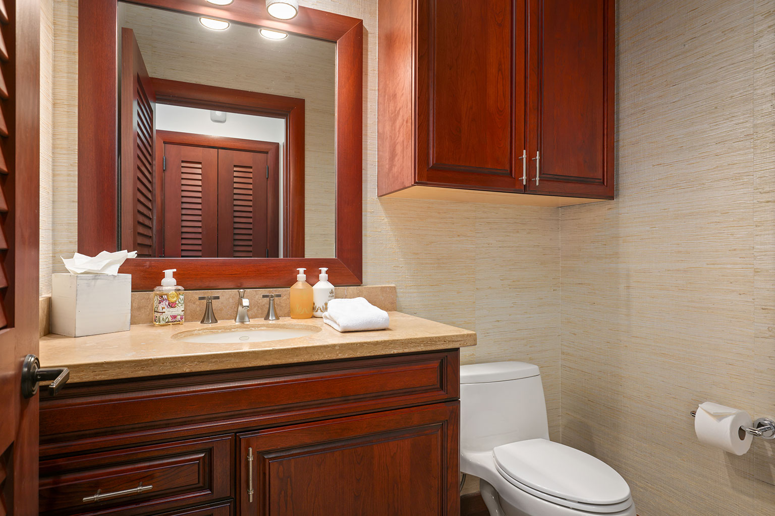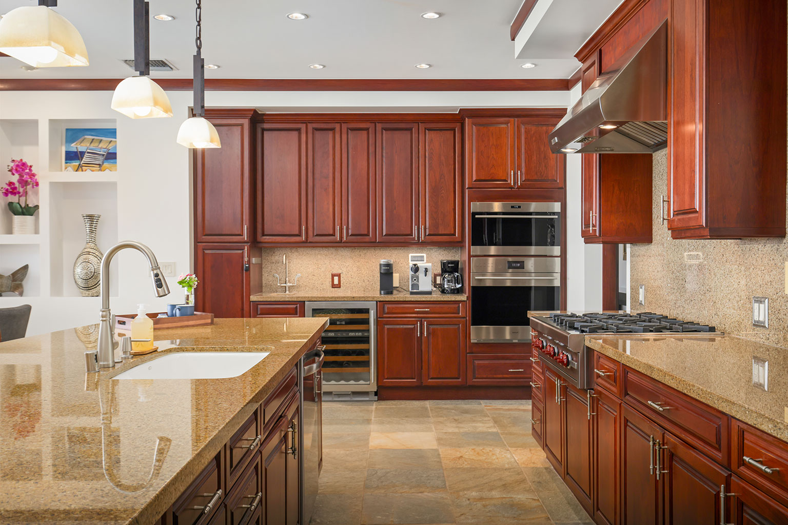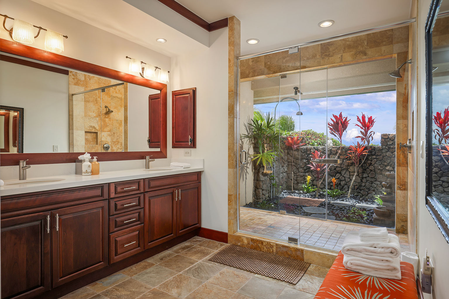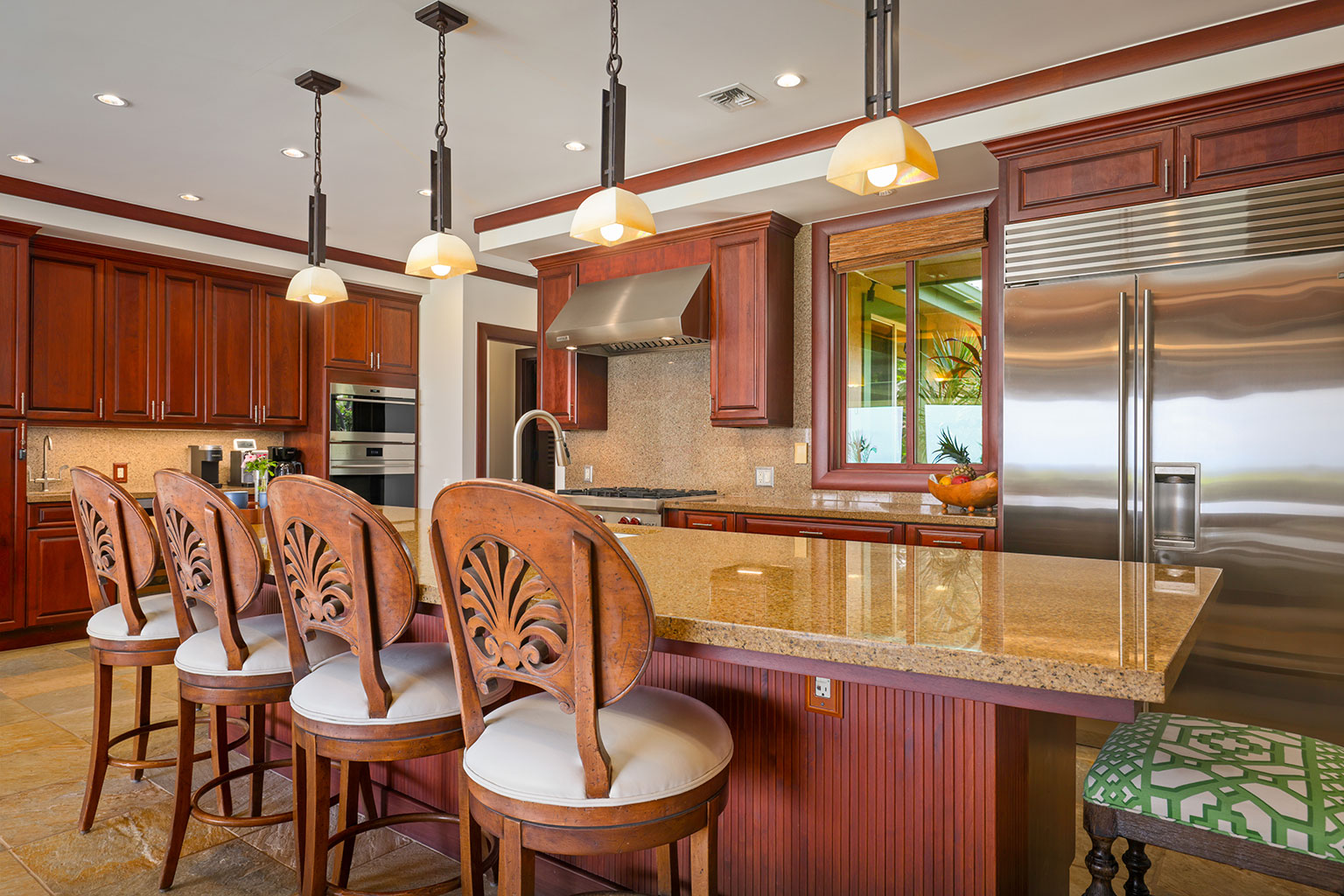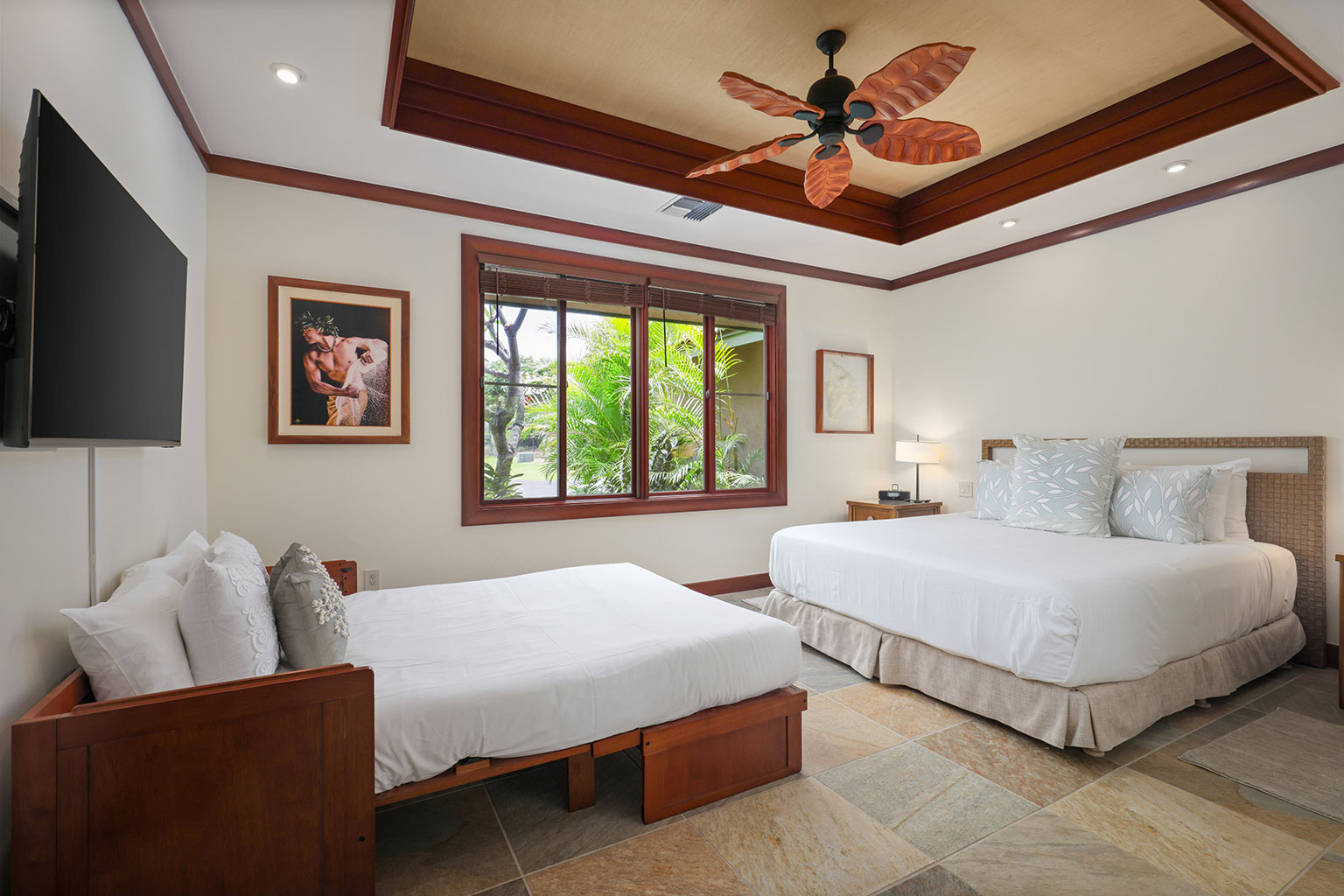 名高いマウナケア・リゾートの高台に佇むこの豪華な邸宅は、コハラコーストを一望する壮大なパノラマビューを誇り、空を美しく染める見事な夕陽をご覧いただけます。リビングエリアは屋外、屋内を意識せずくつろげるように設計されています。屋根付きのラナイ(ベランダ)は広々としており、使い心地のよいラウンジチェアに横たわり、海からの爽やかな風に包まれて時間を過ごすのにぴったりです。屋内の豪華なリビングルームは、心安らぐ空間です。装備の充実したキッチン、最大8人で利用できる広いダイニングエリア、また8人分のお席のあるバーエリアも備わっております。寝室は3部屋あり、いずれのお部屋にもキングベッドが1台入っていて、バスルームも併設されています。プライマリースイートにはスパ施設のようなジャグジータブ、プライベート屋外シャワー、そして贅沢な作りのウォークインクローゼットがあります。宿泊に柔軟な対応ができるよう、3部屋目の寝室にはキングベッド1台の他に、クイーンサイズのマーフィーベッドをご用意しております。その他、ランドリールーム、エアコン、シーリングファン、プライベートプール、ホットタブもございます。
